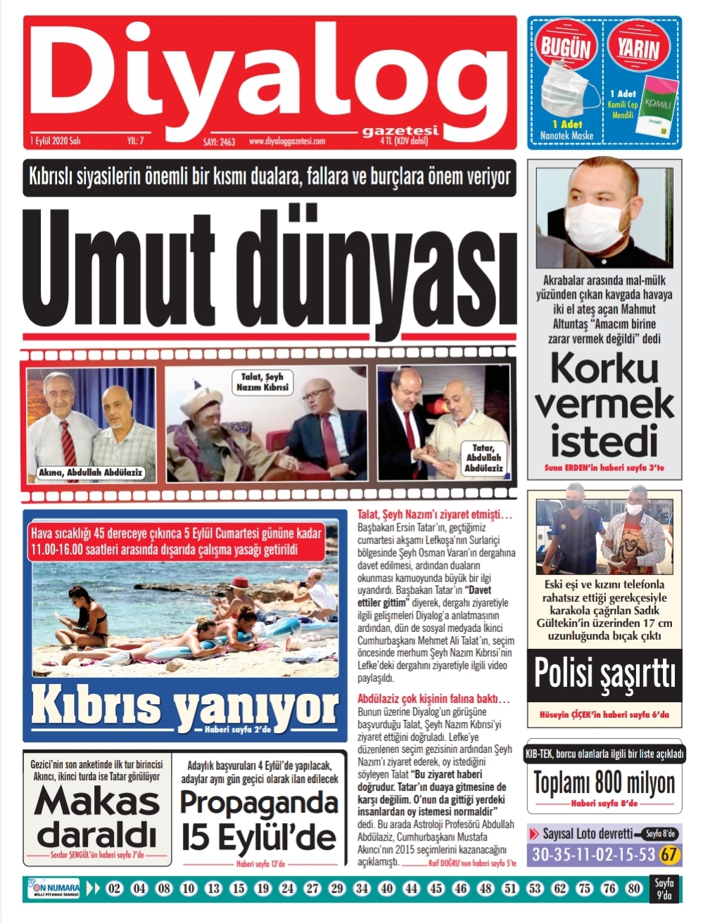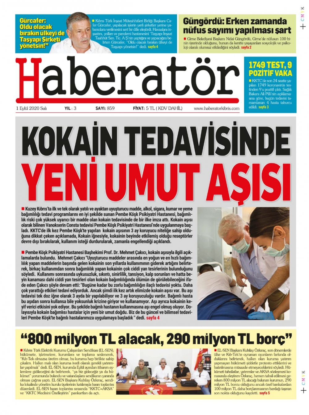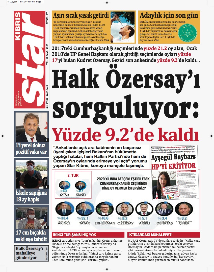 1 Eylül 2020 tarihinde KKTC’de yayınlanan gazete manşetleri
