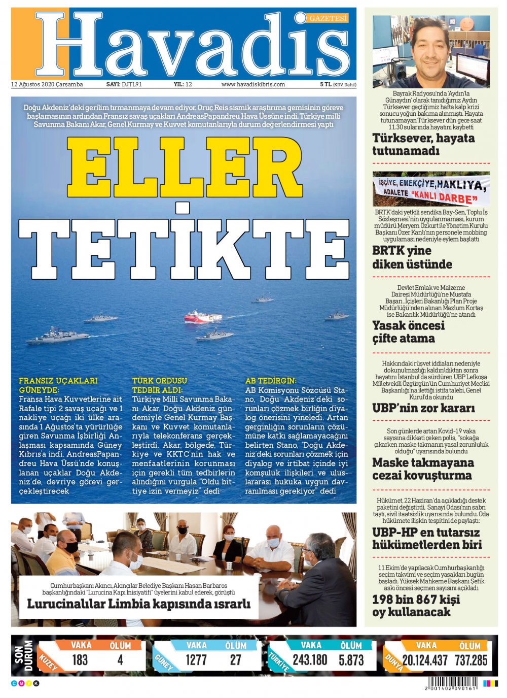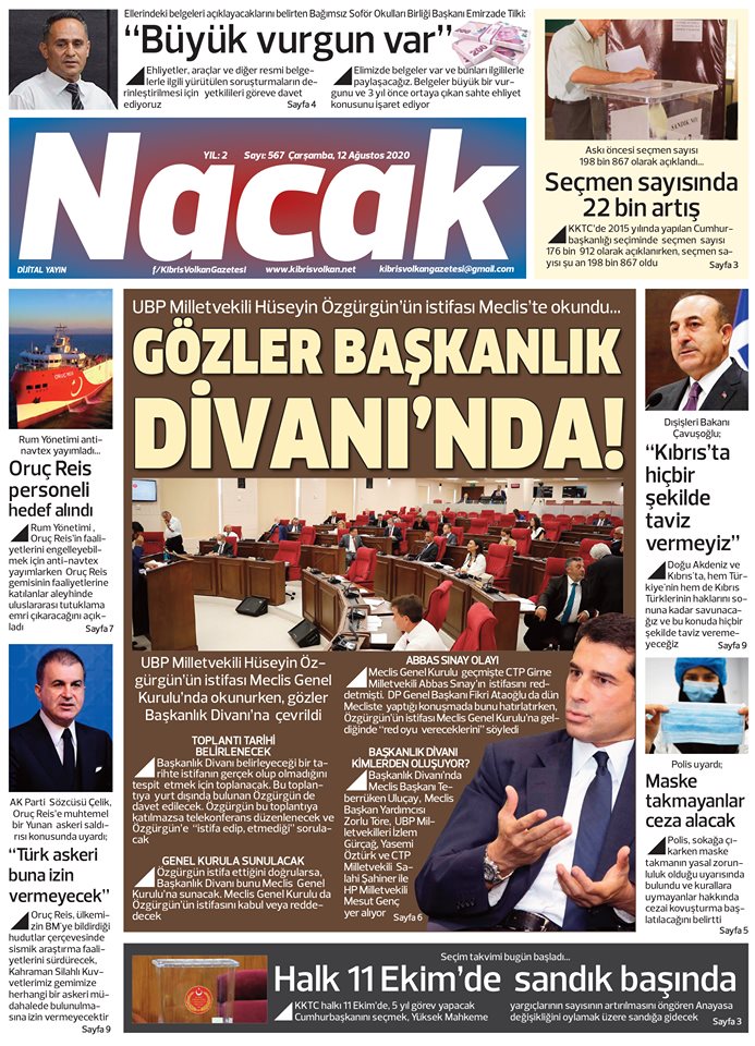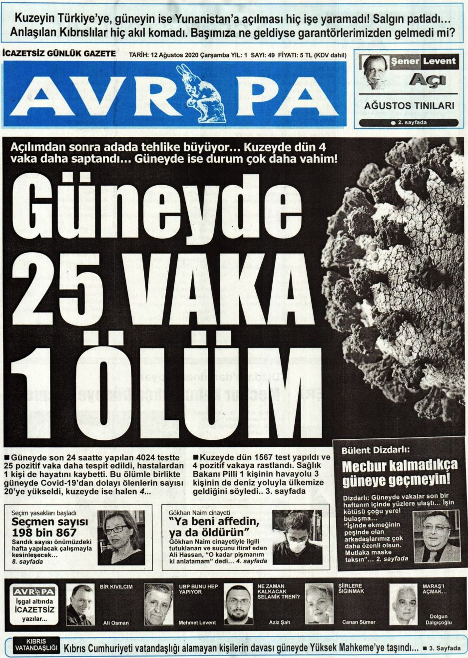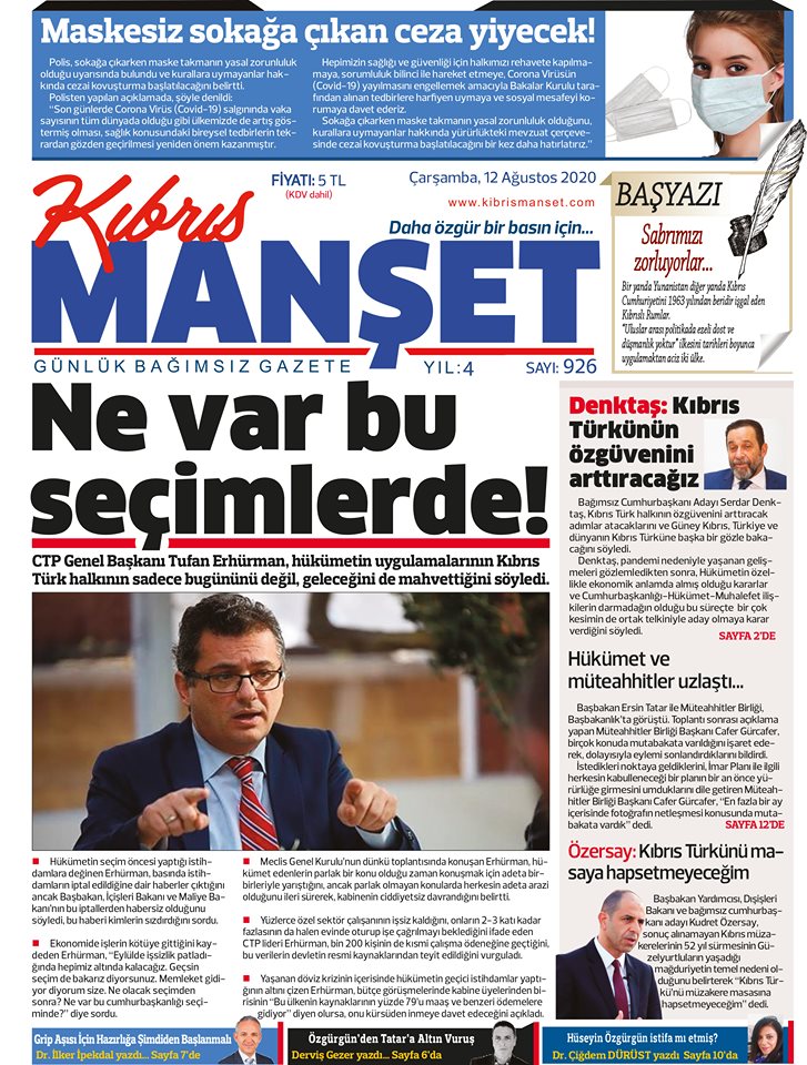 12 Ağustos 2020 tarihinde KKTC yayınlanan gazete manşetleri