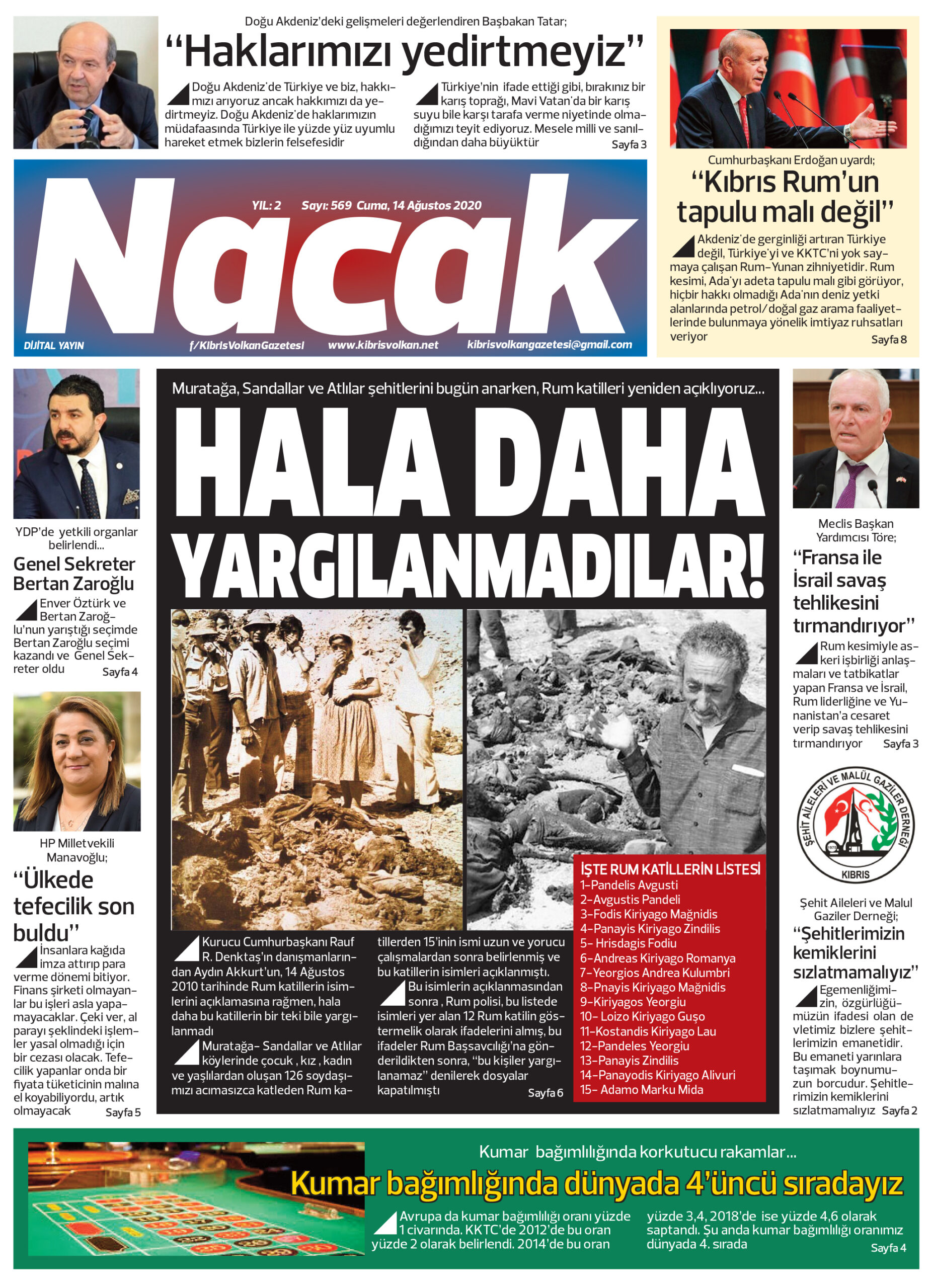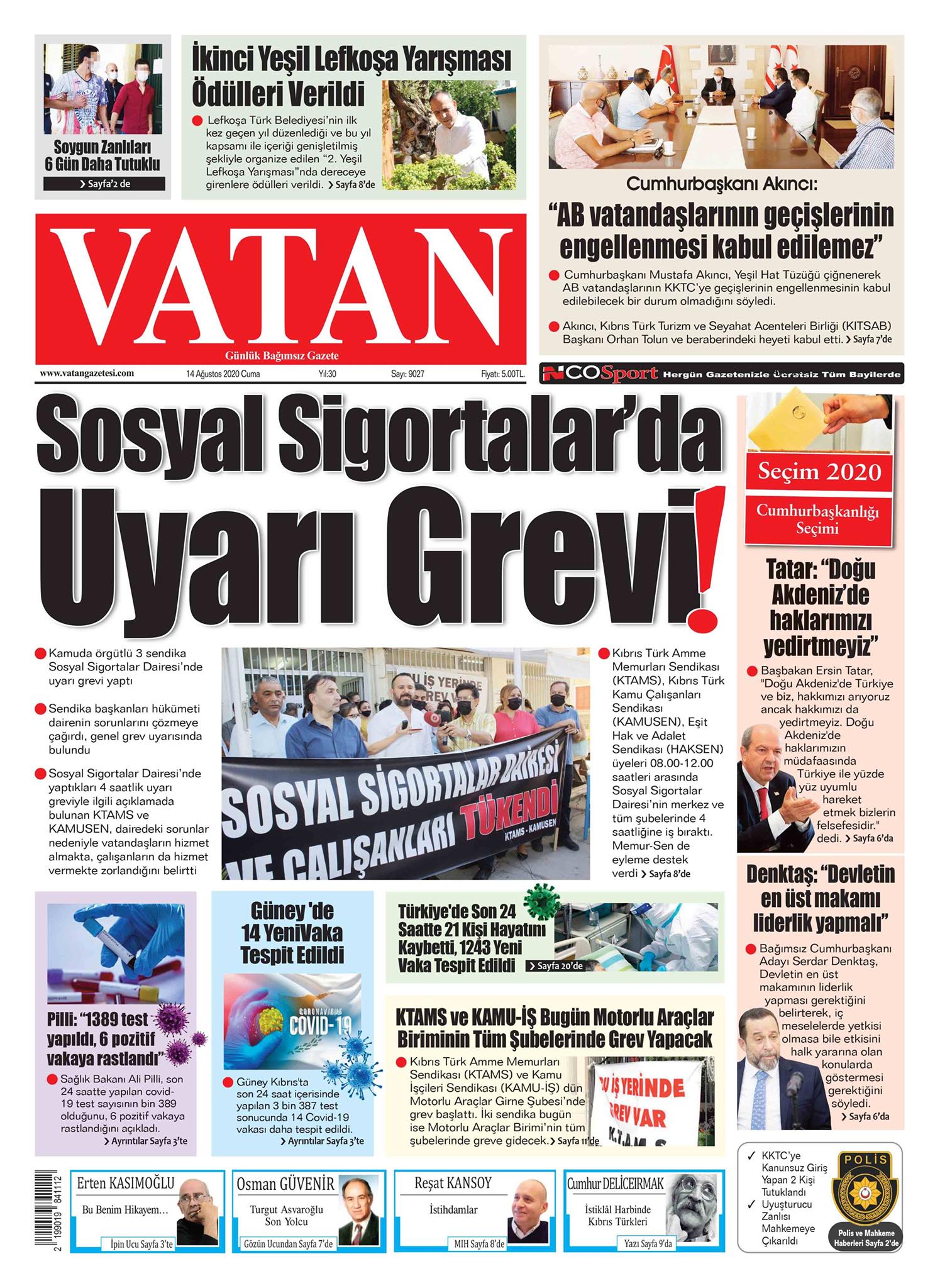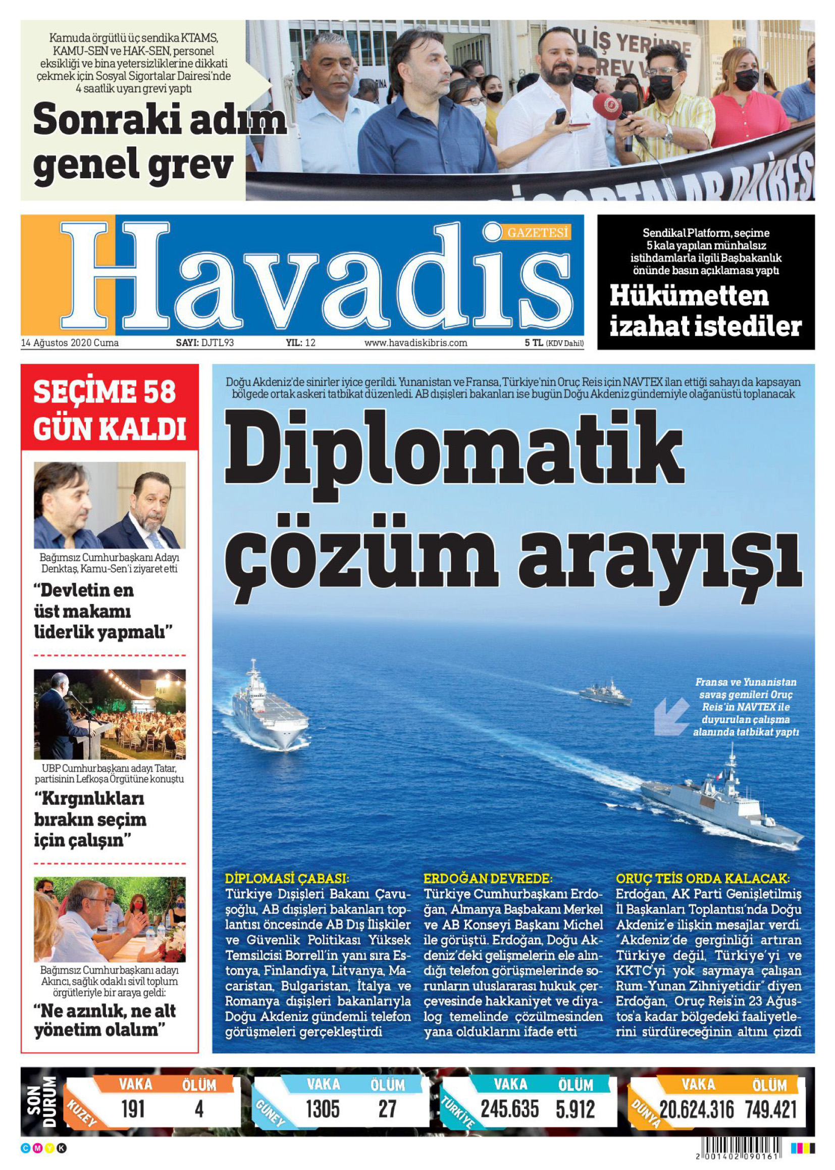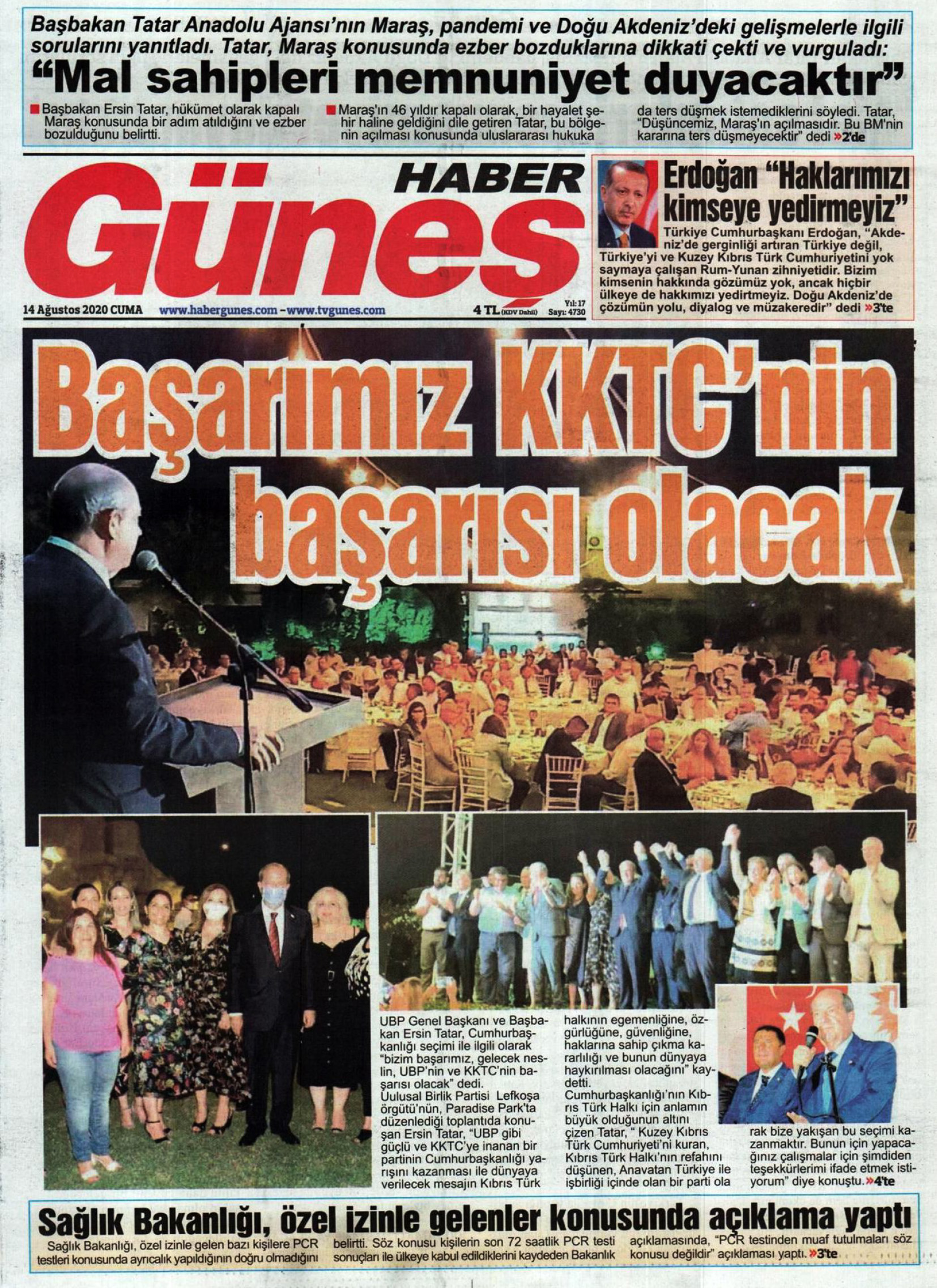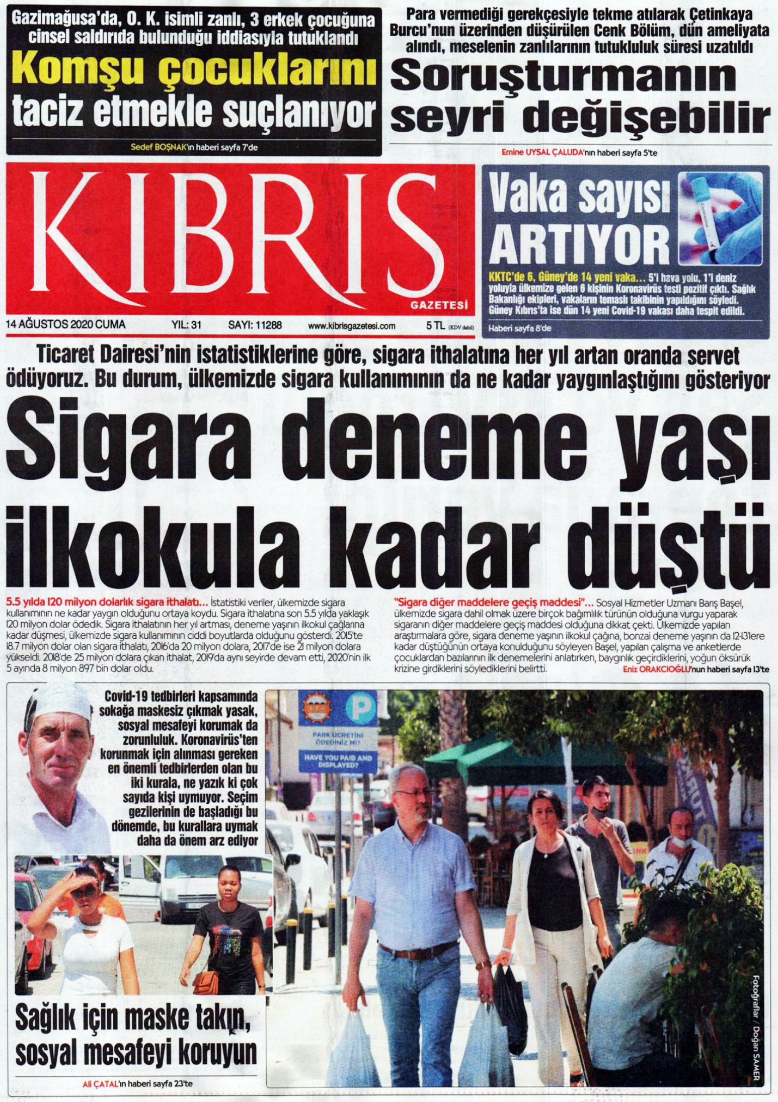 14 Ağustos 2020 tarihinde KKTC yayınlanan gazete manşetleri