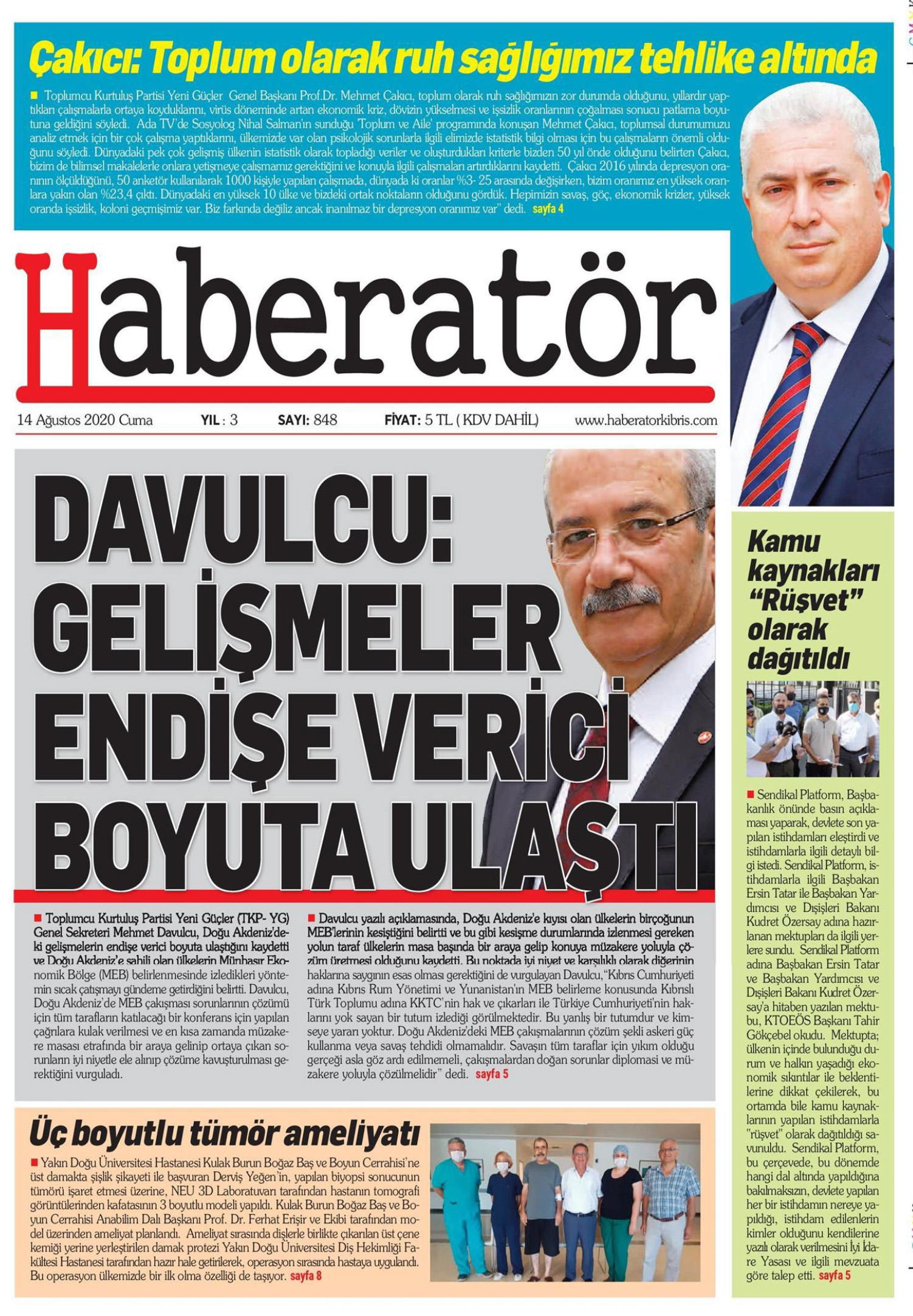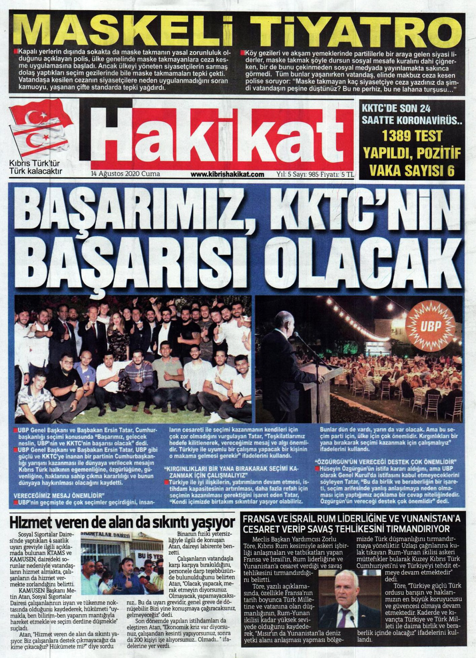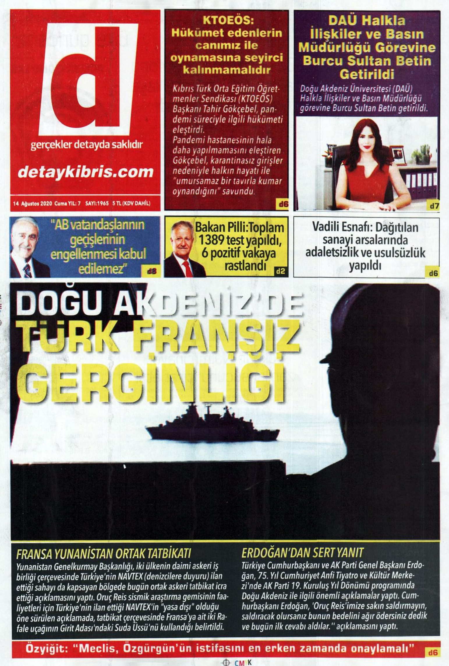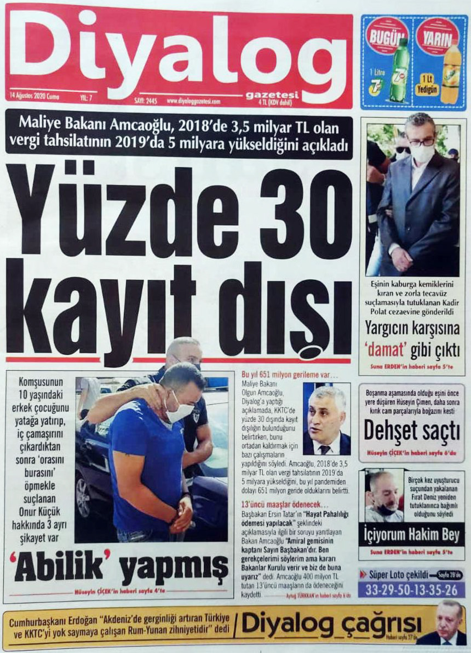 14 Ağustos 2020 tarihinde KKTC yayınlanan gazete manşetleri