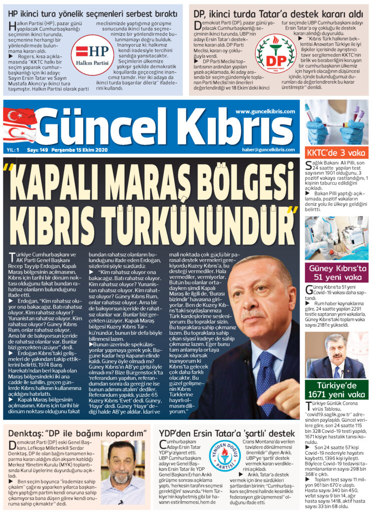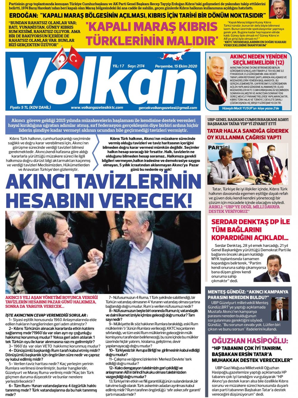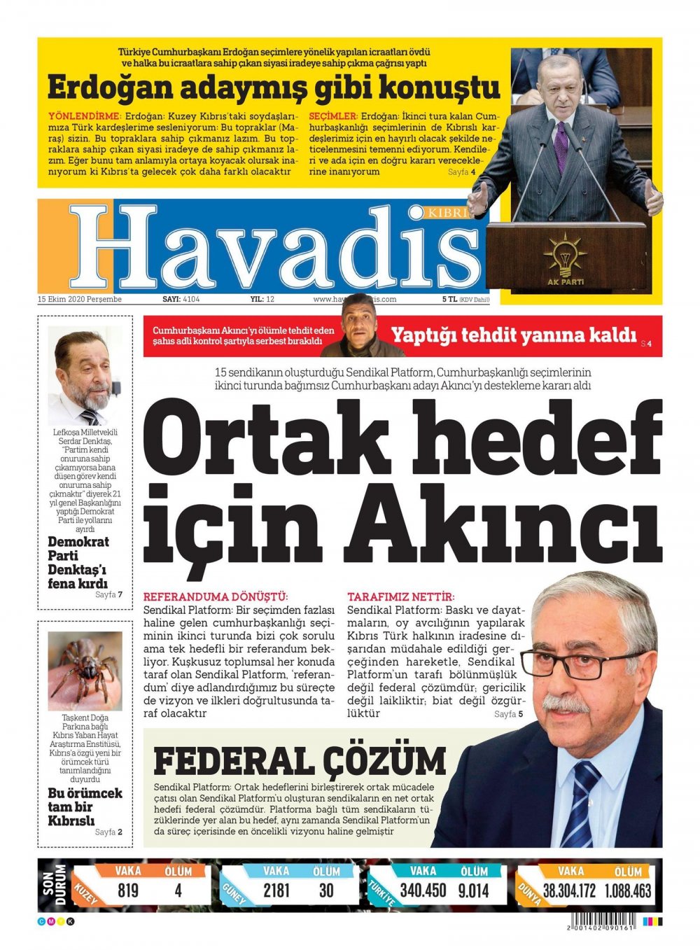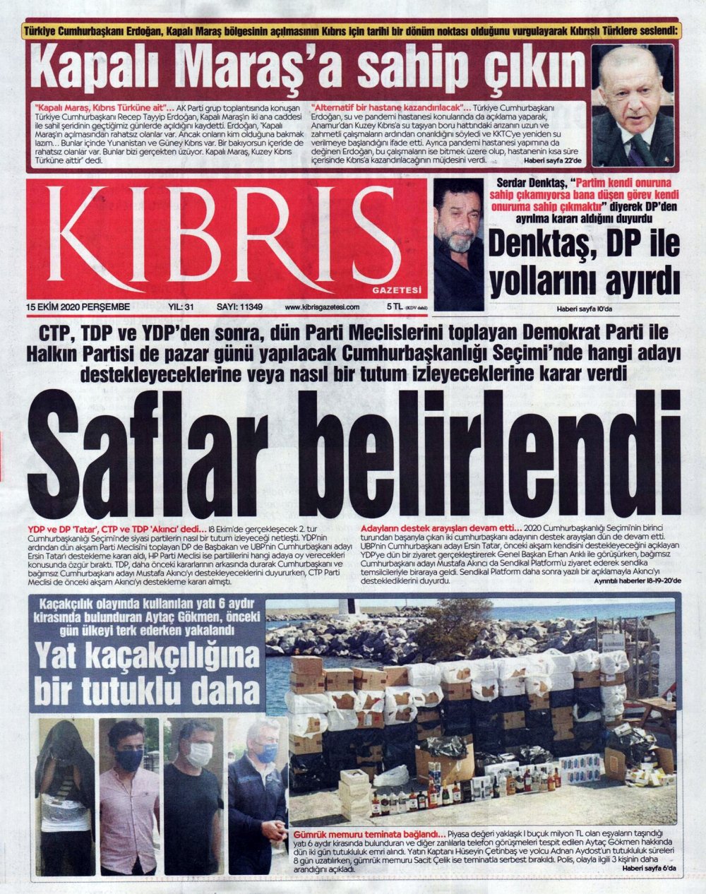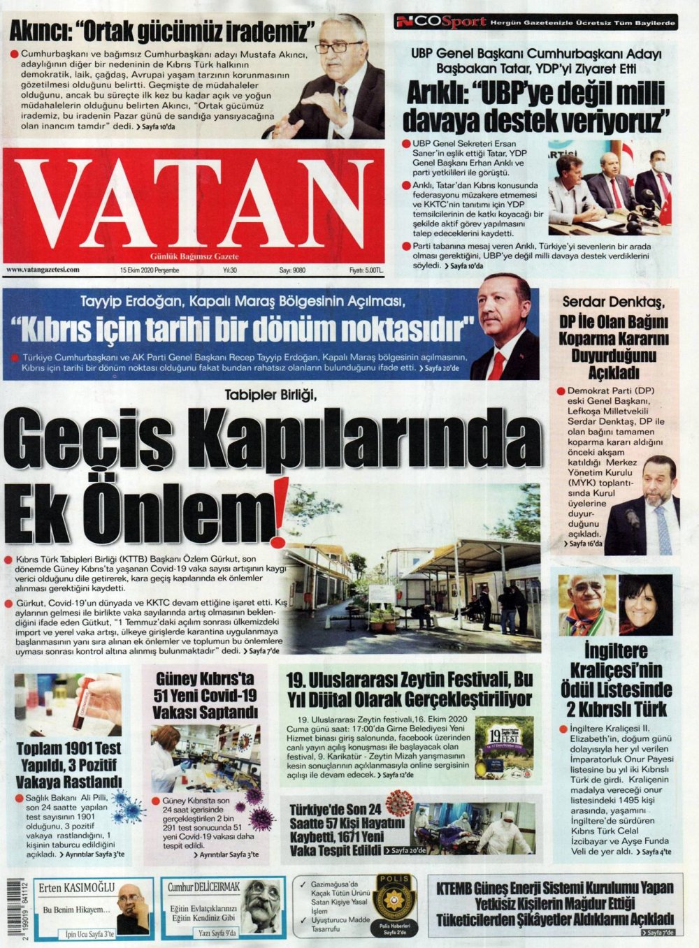 15 Ekim 2020 tarihinde KKTC’de yayınlanan gazete manşetleri