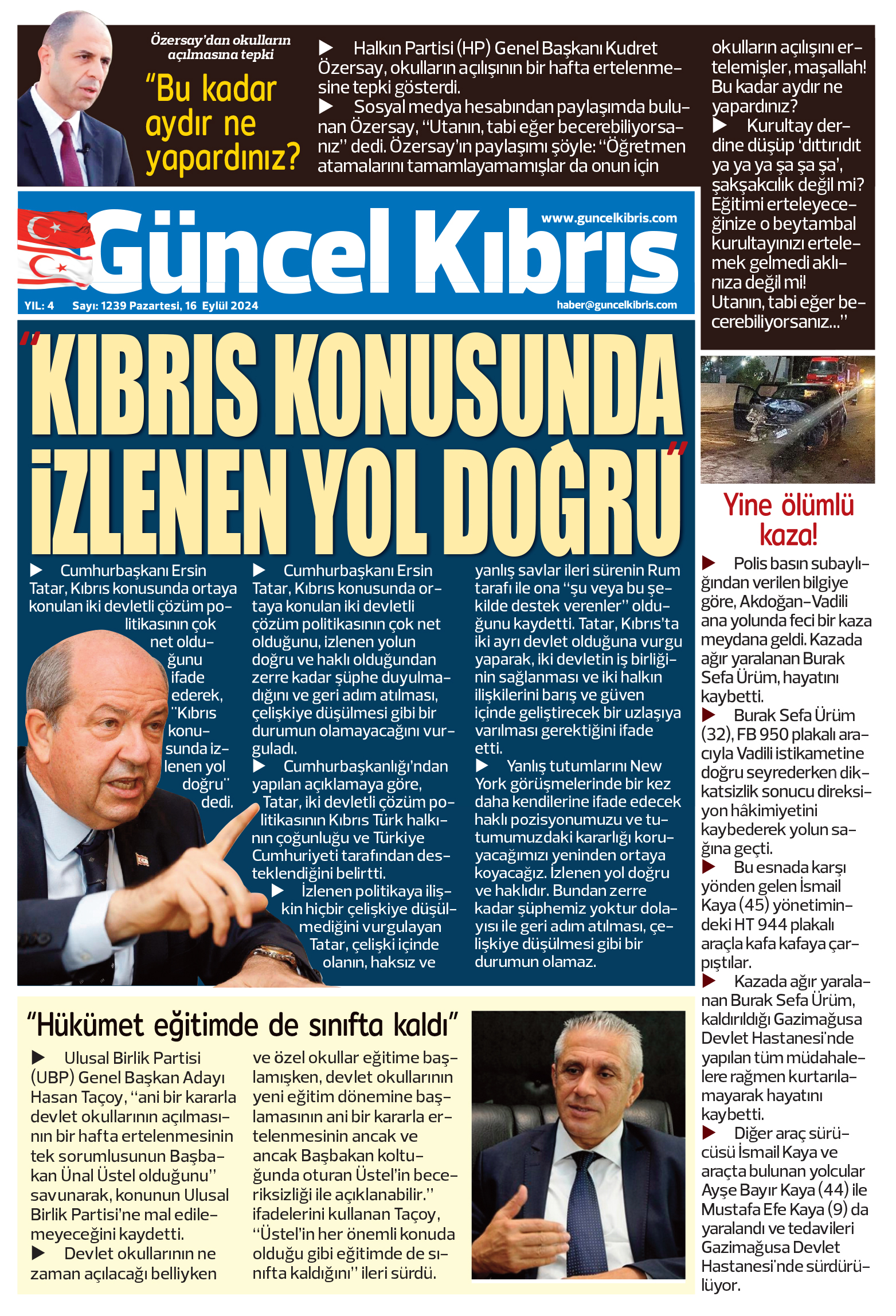 15 Eylül 2024’te Güncel Kıbrıs ve KKTC’de yayınlanan gazete manşetleri