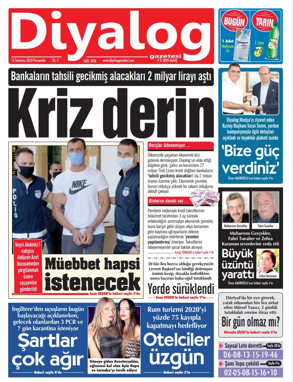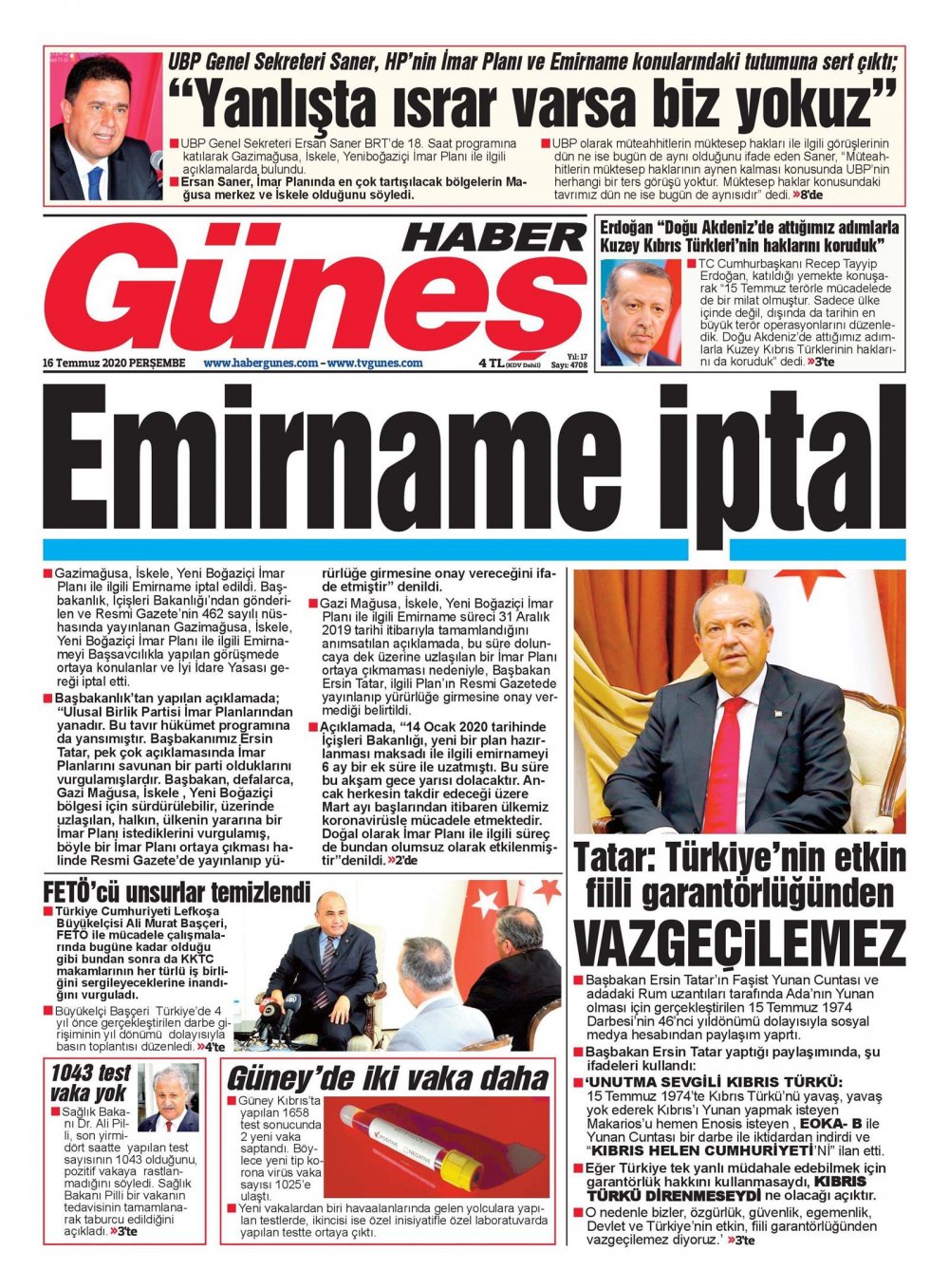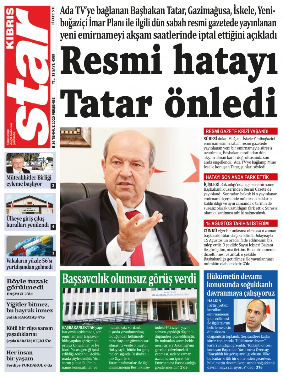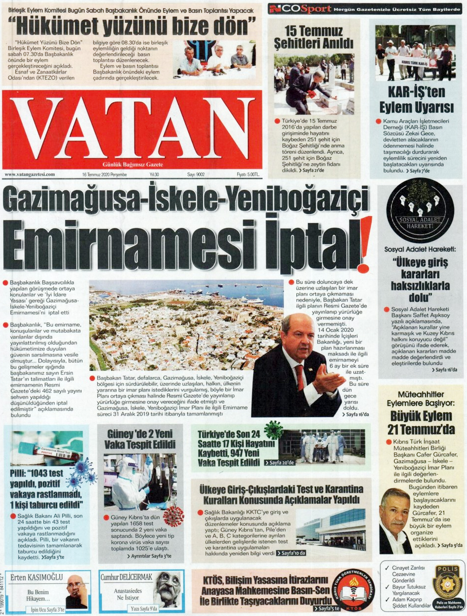 16 Temmuz 2020 tarihinde KKTC yayınlanan gazete manşetleri