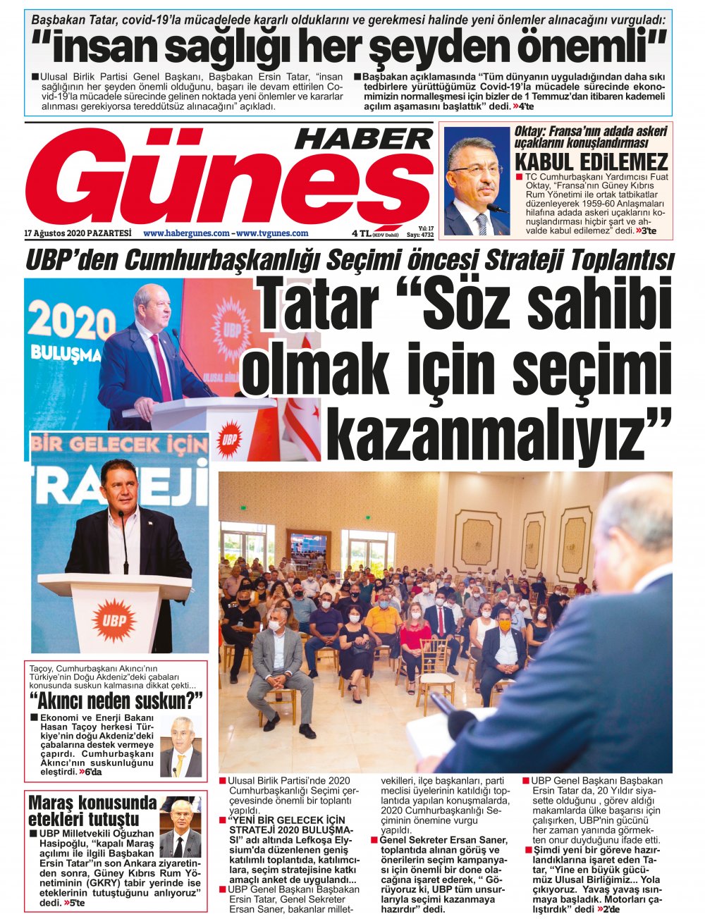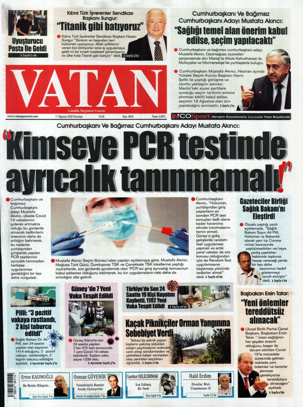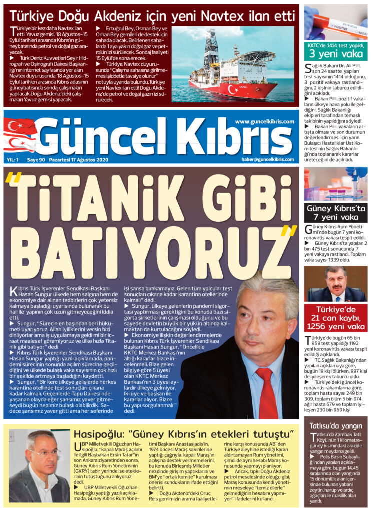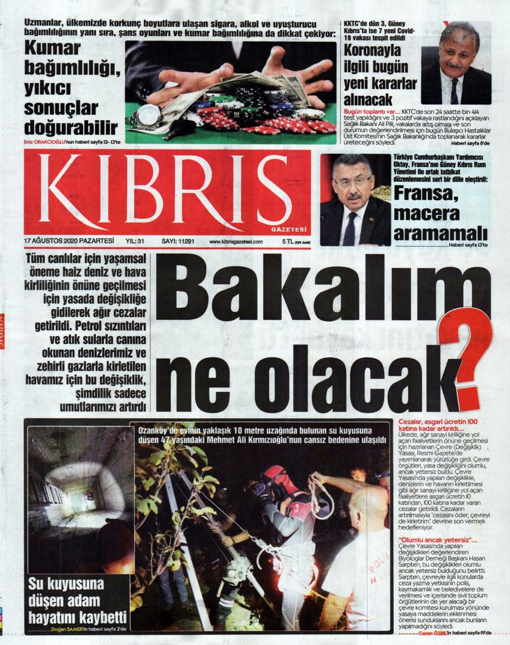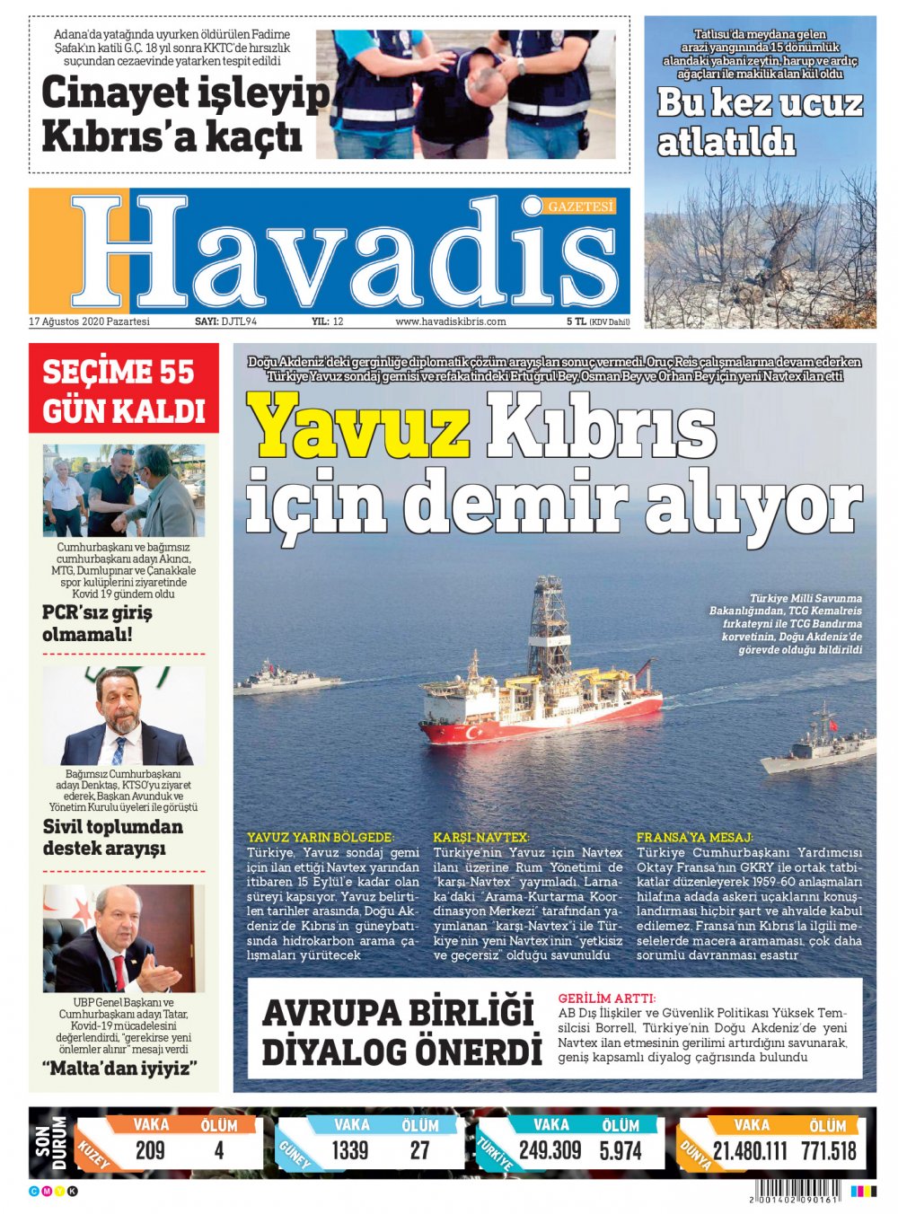 17 Ağustos 2020 tarihinde KKTC yayınlanan gazete manşetleri