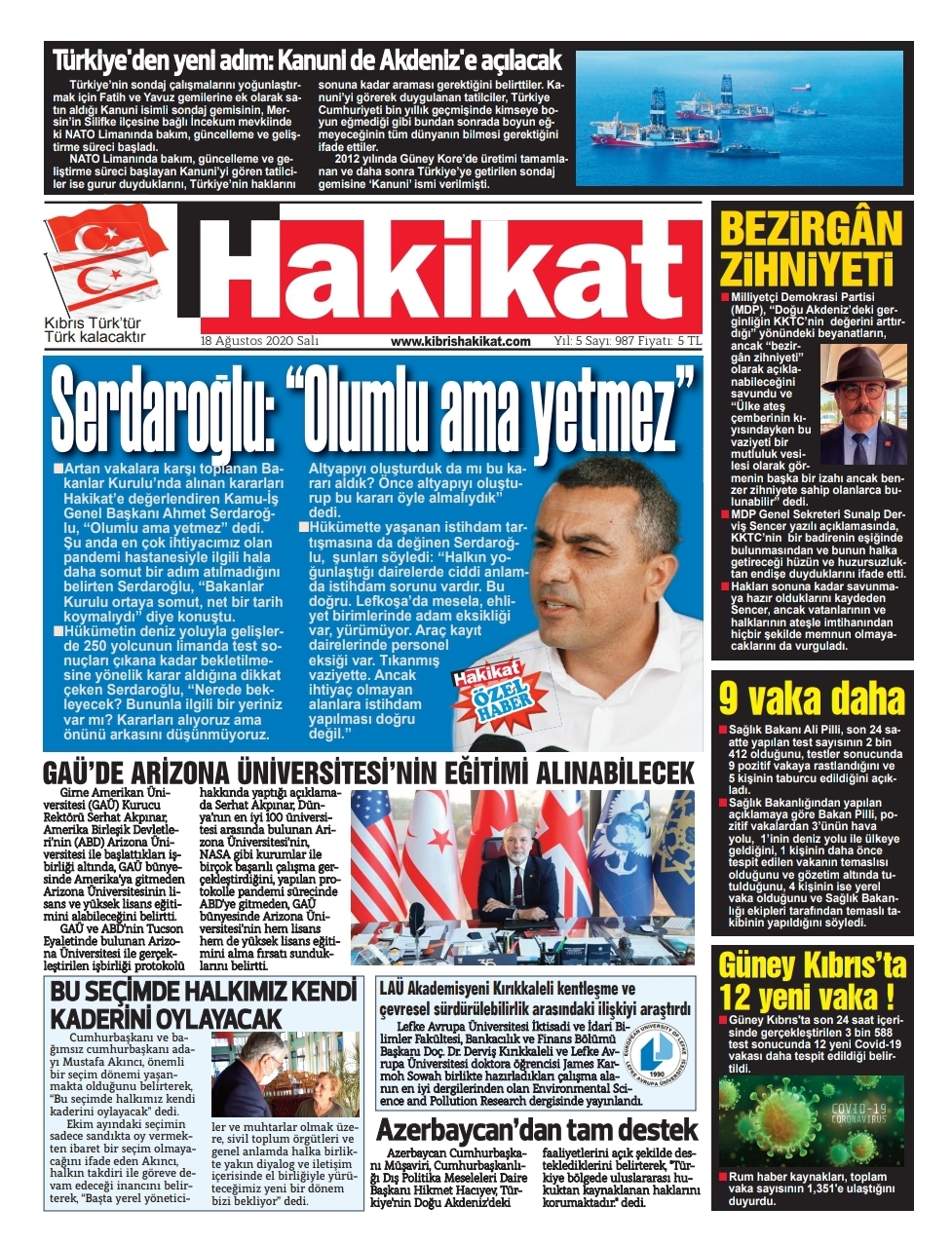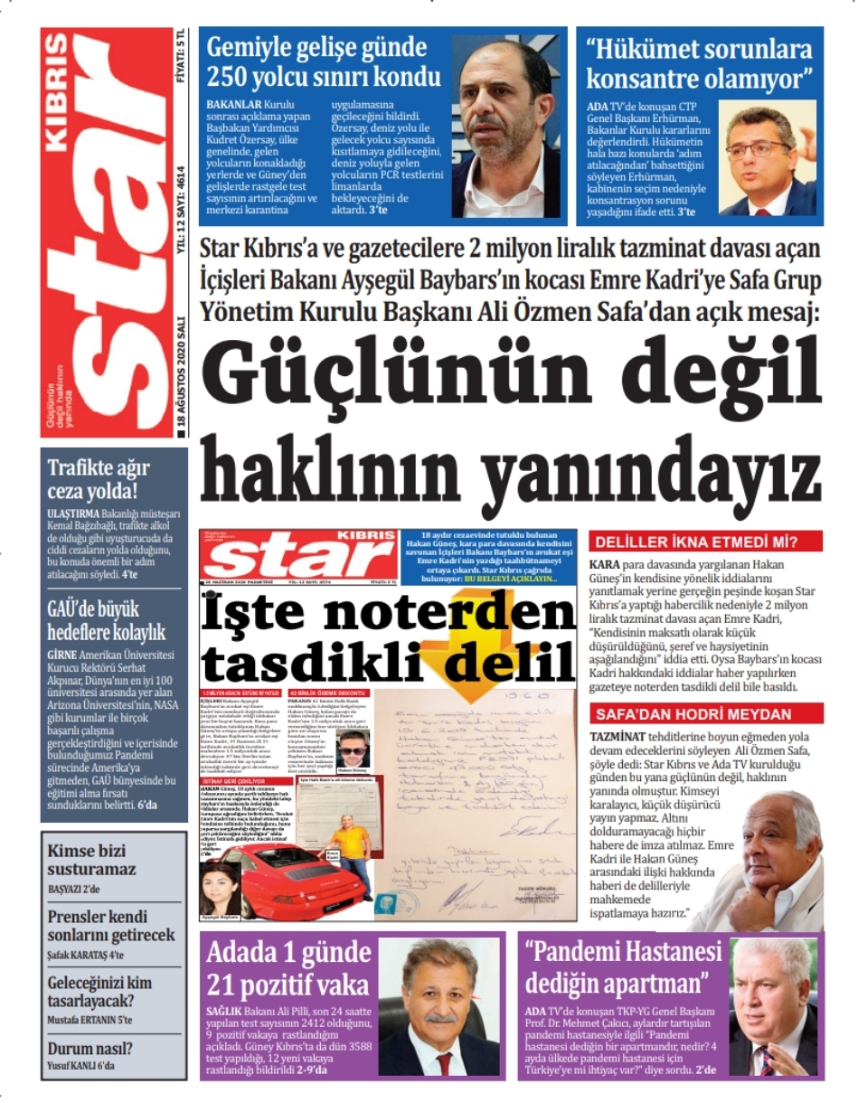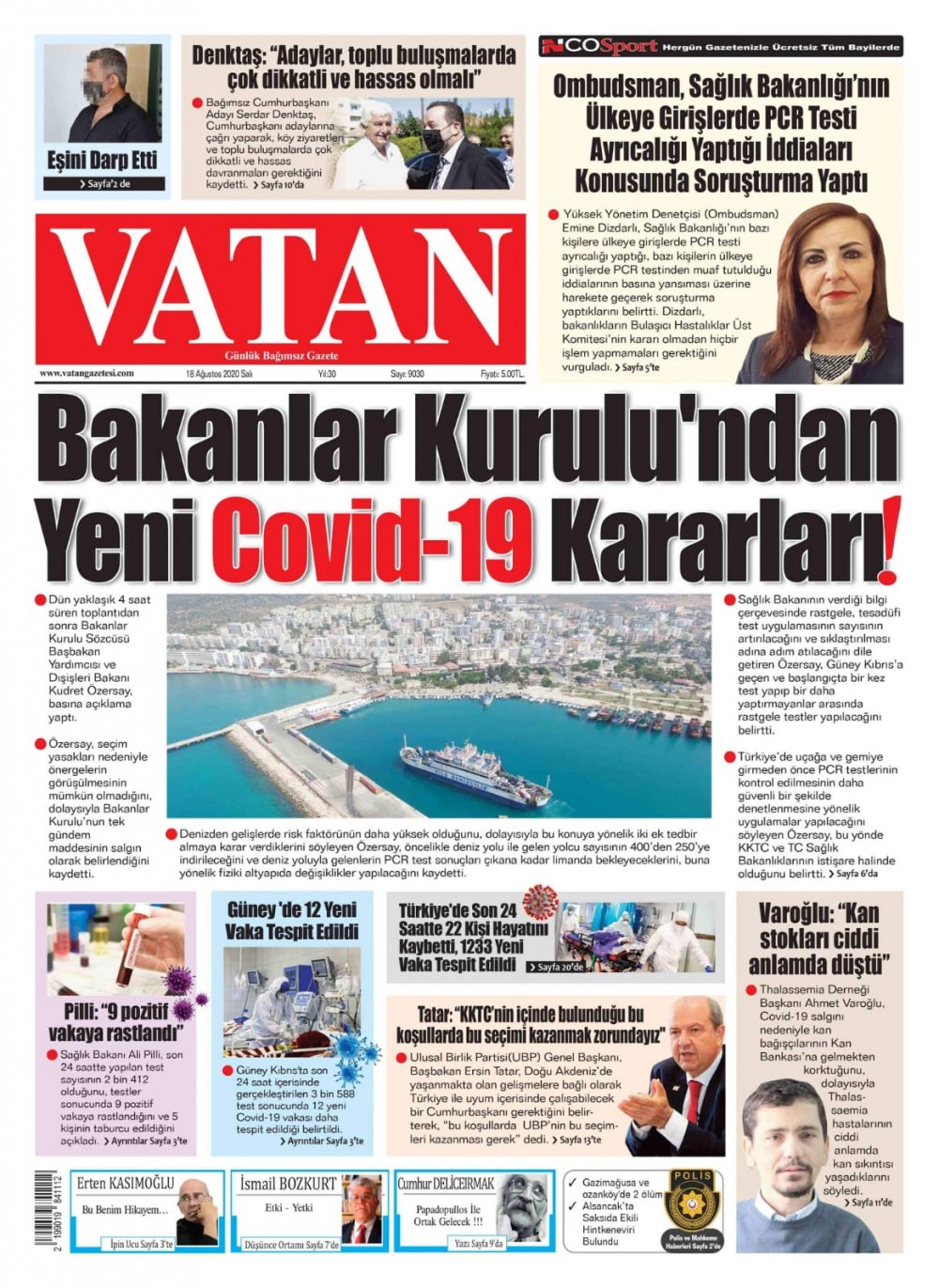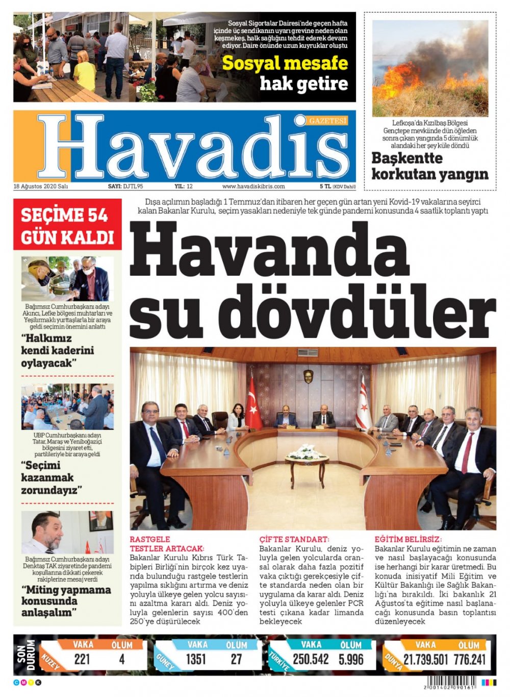 18 Ağustos 2020 tarihinde KKTC yayınlanan gazete manşetleri