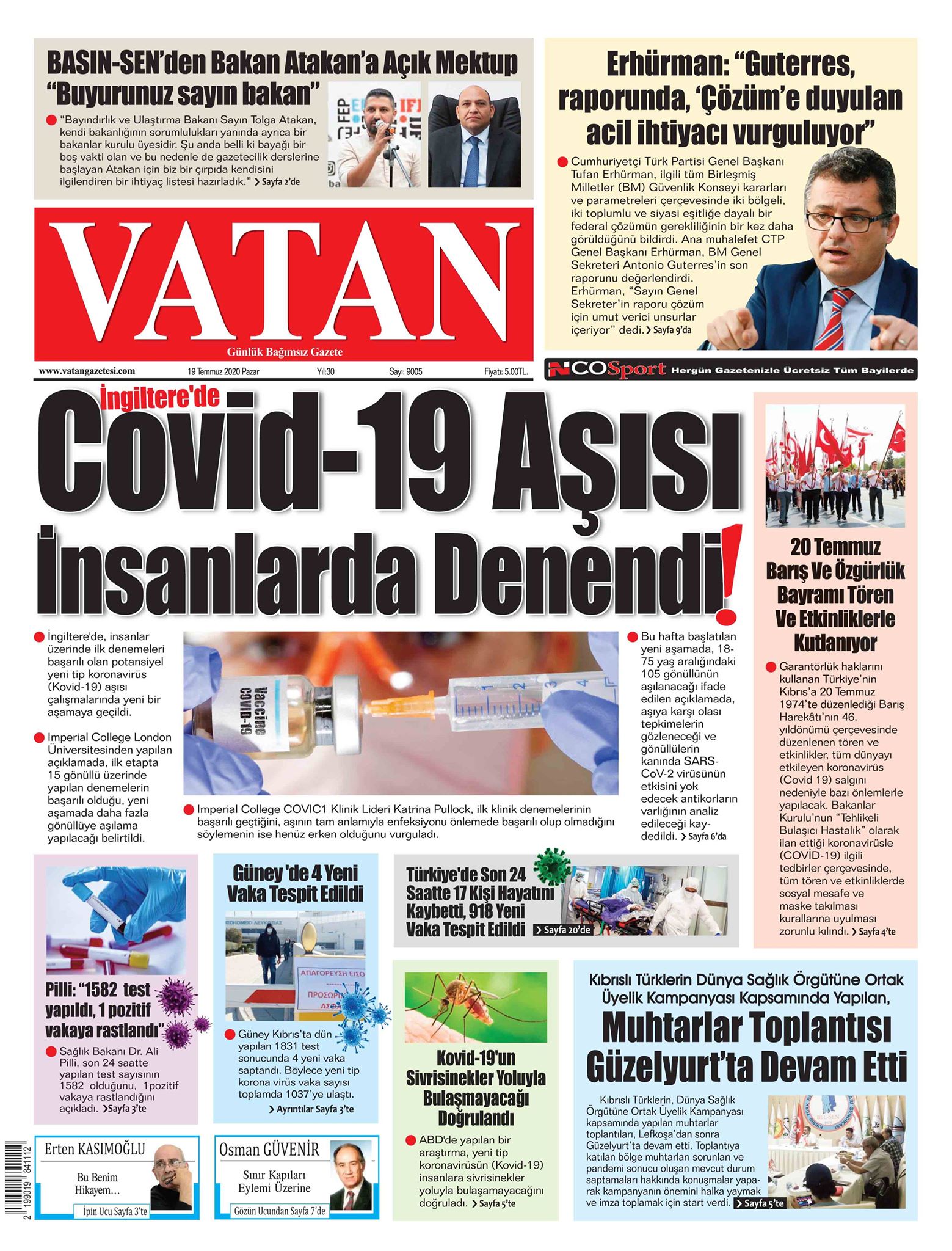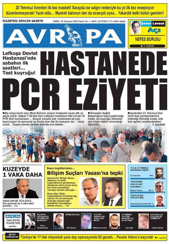 19 Temmuz 2020 tarihinde KKTC yayınlanan gazete manşetleri