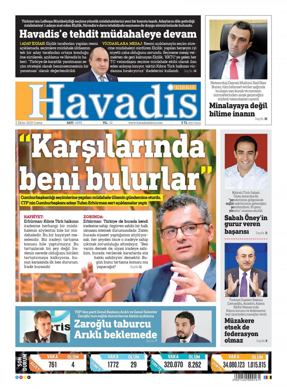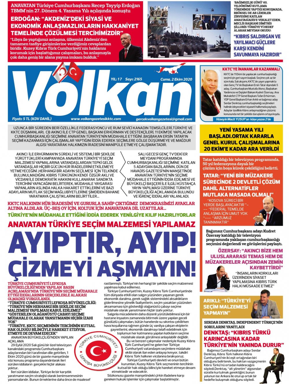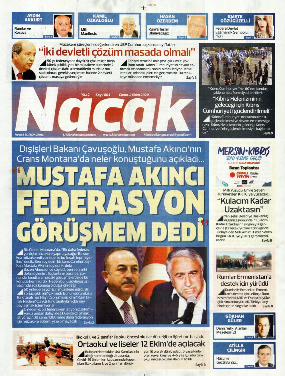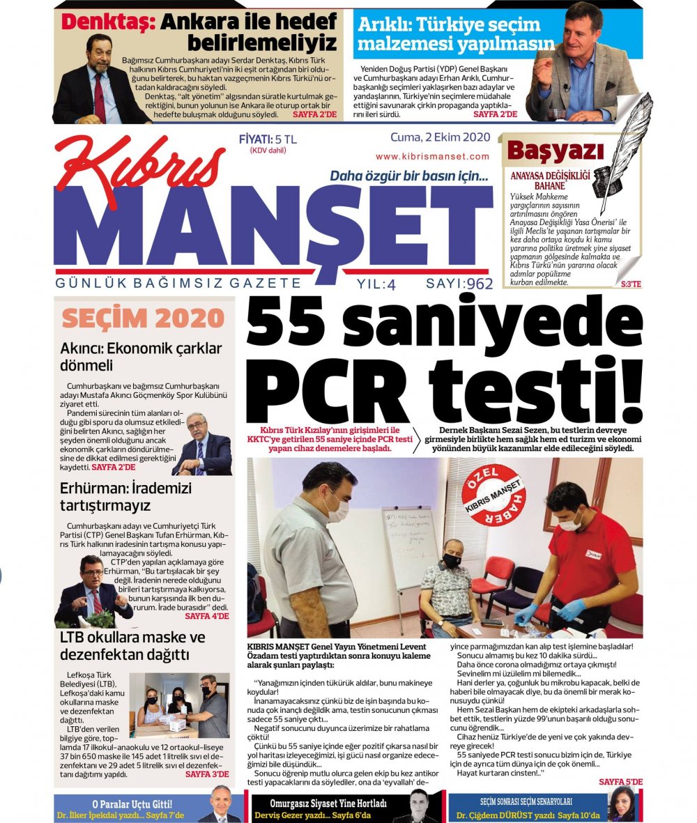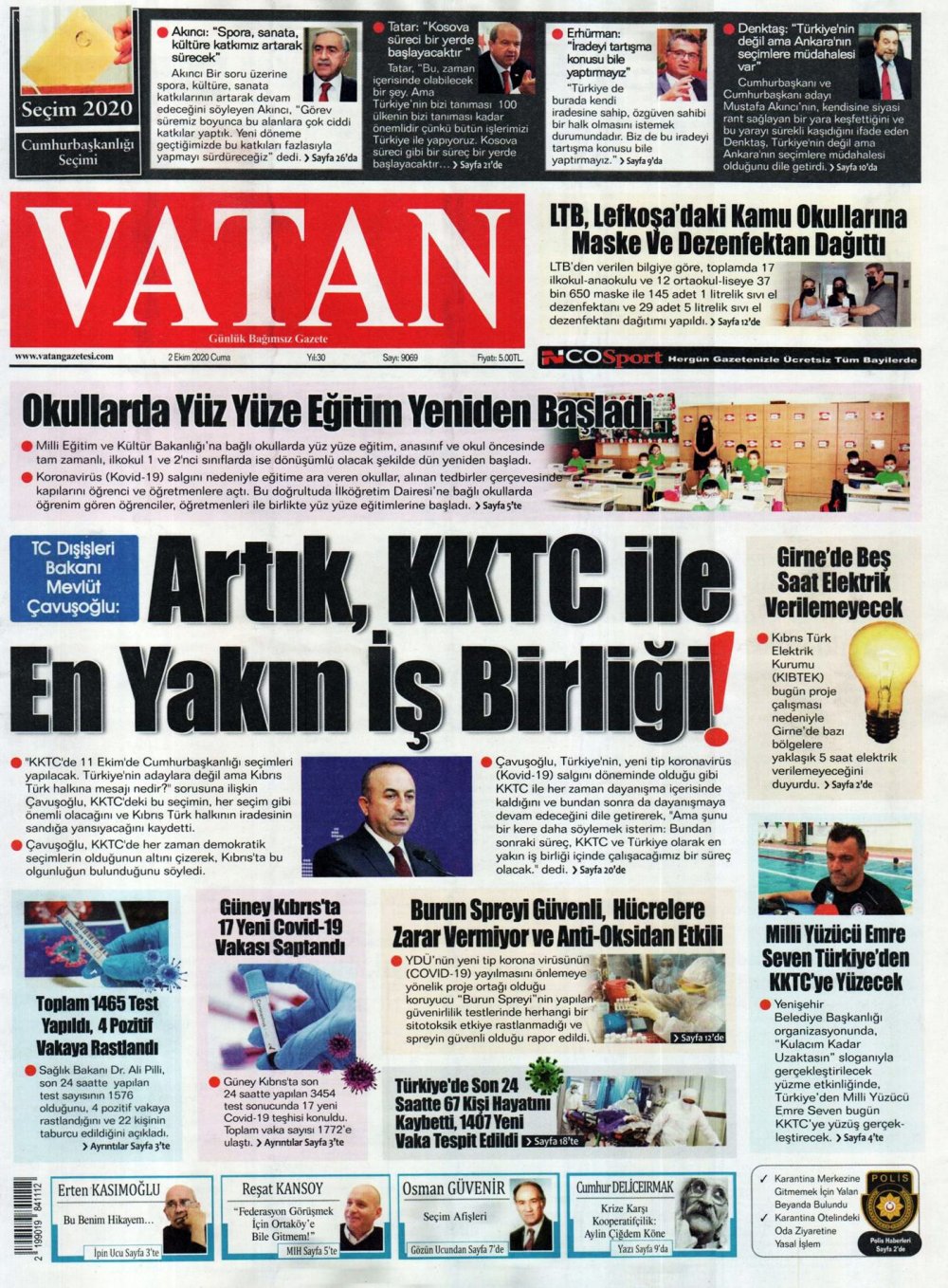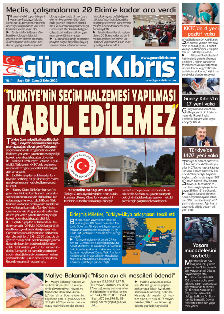 2 Ekim 2020 tarihinde KKTC’de yayınlanan gazete manşetleri