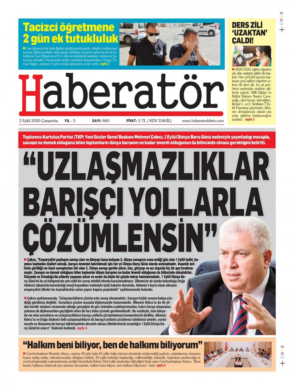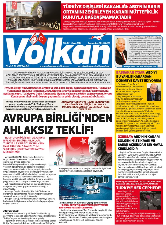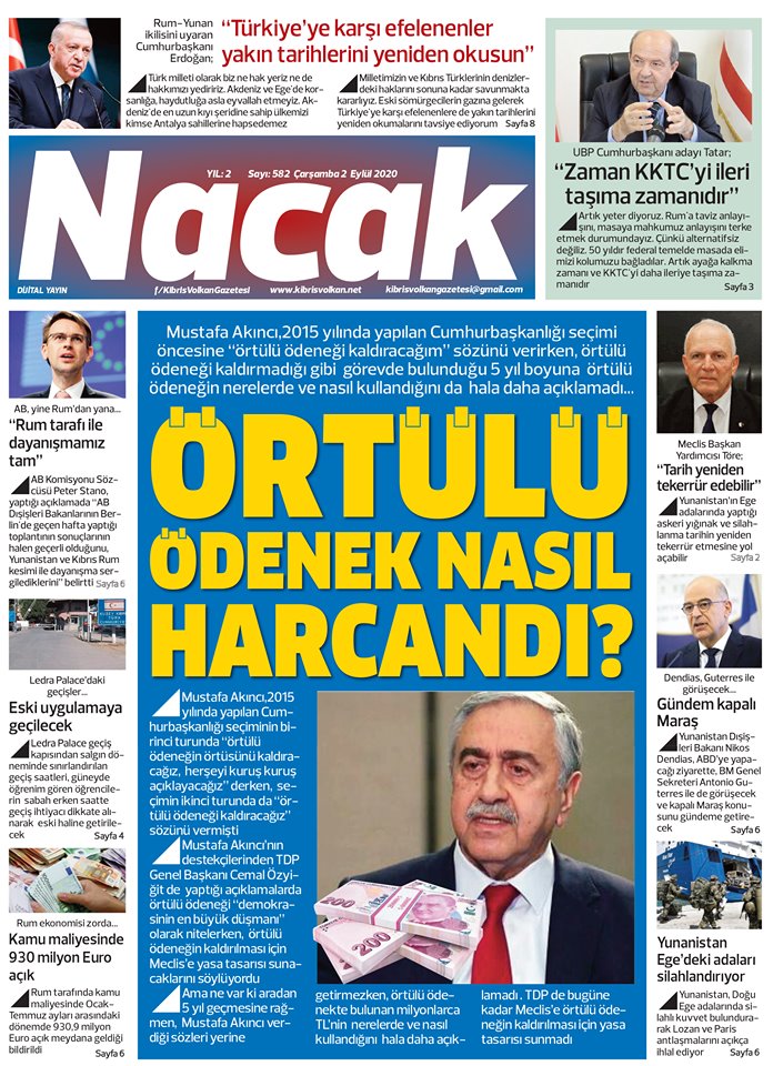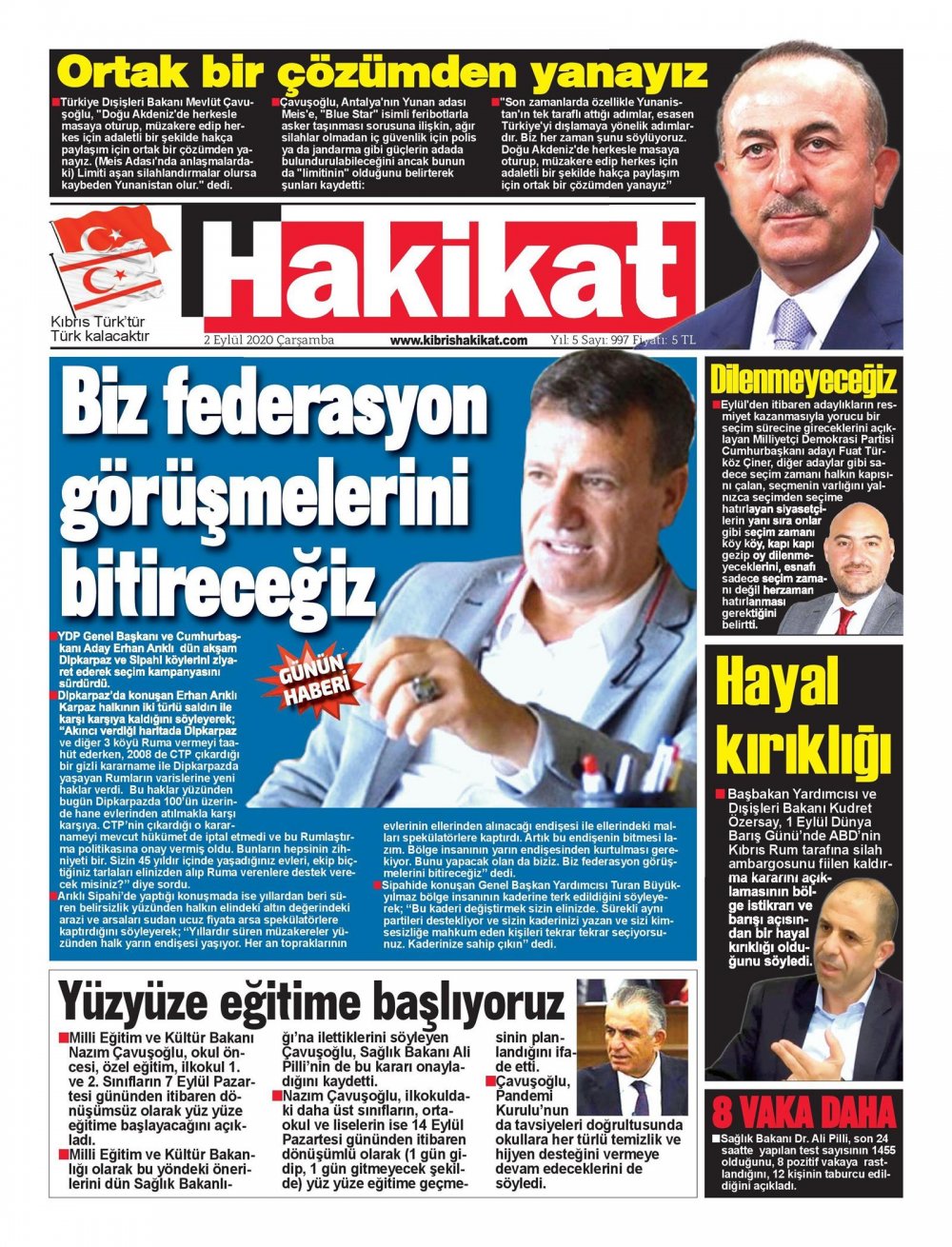 2 Eylül 2020 tarihinde KKTC’de yayınlanan gazete manşetleri