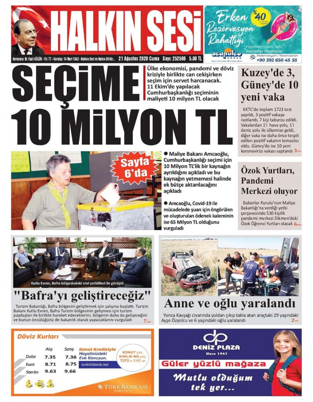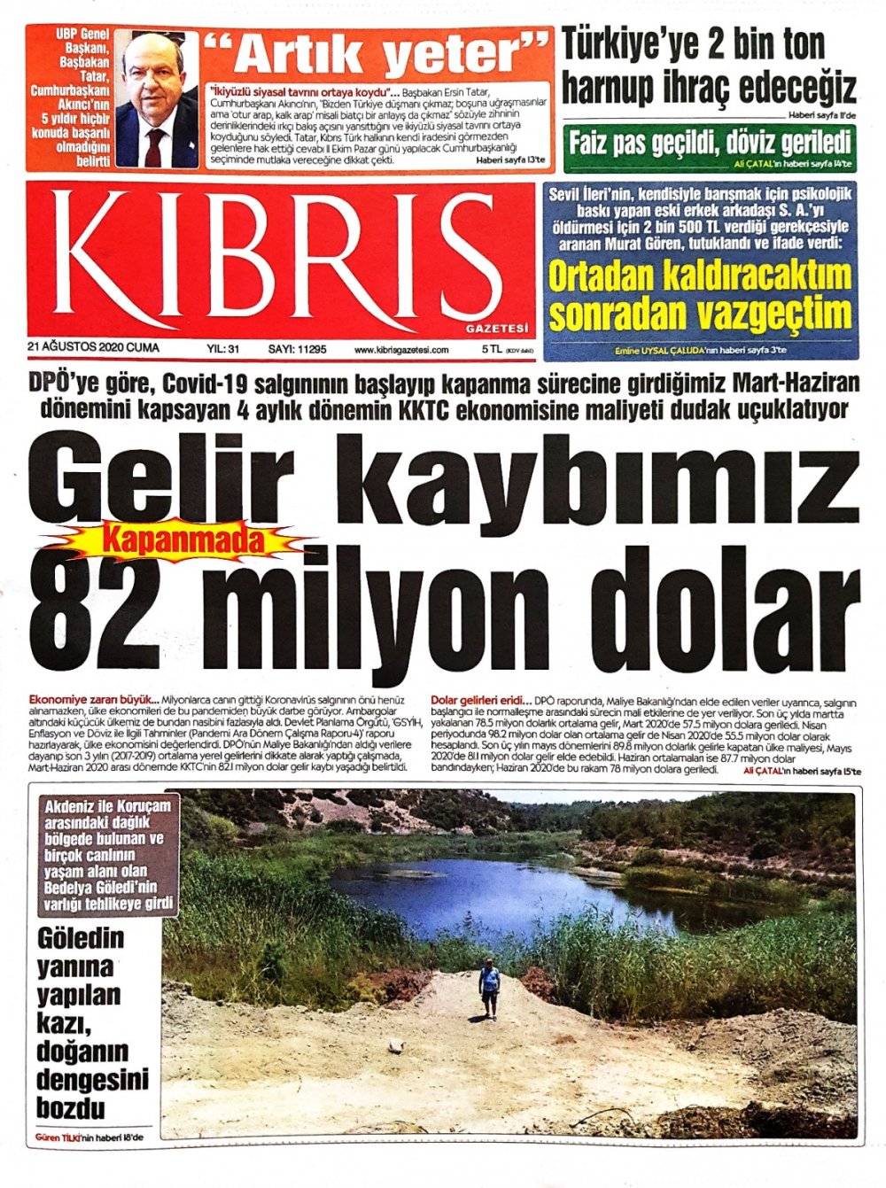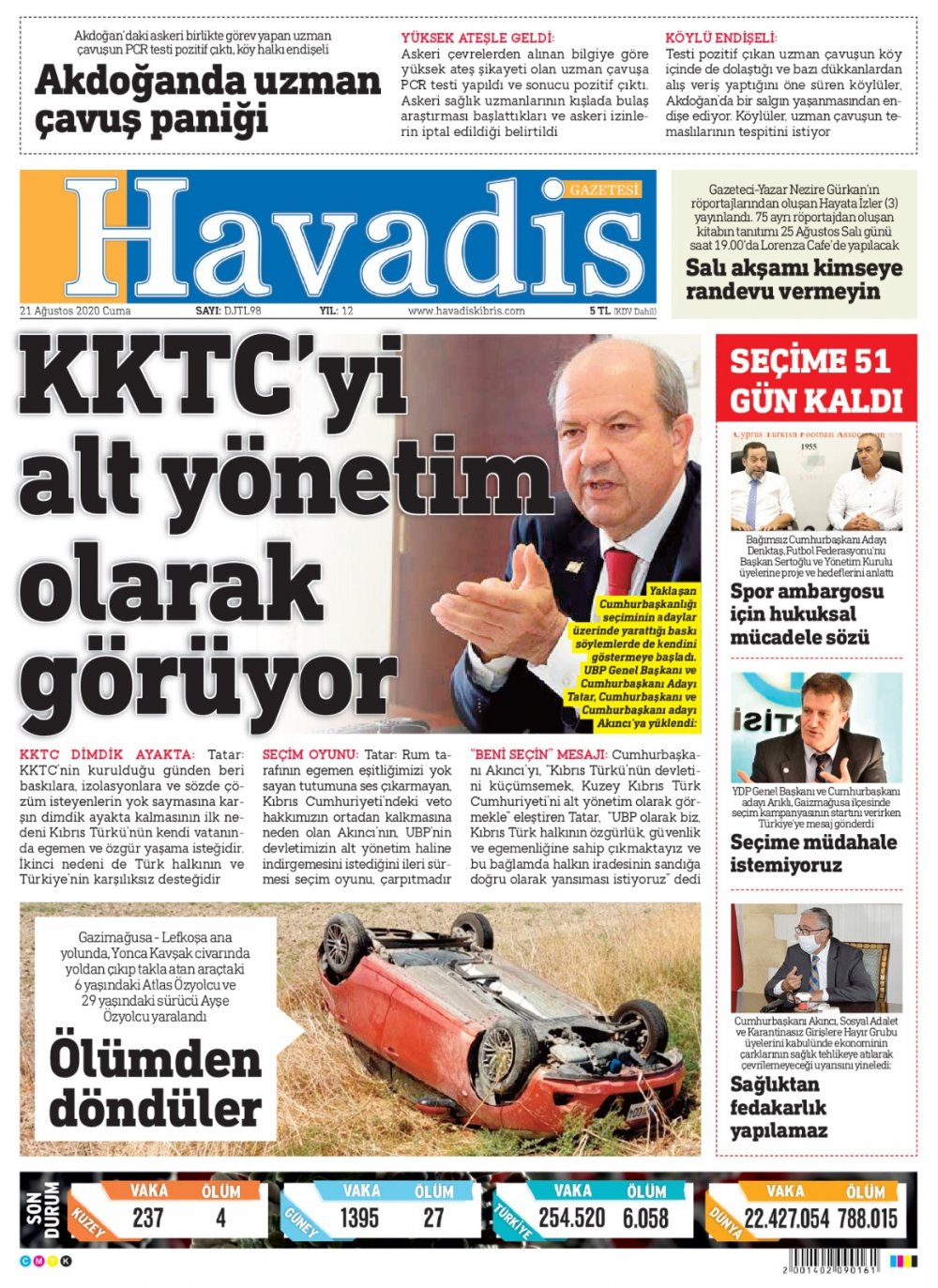21 Ağustos 2020 tarihinde KKTC yayınlanan gazete manşetleri