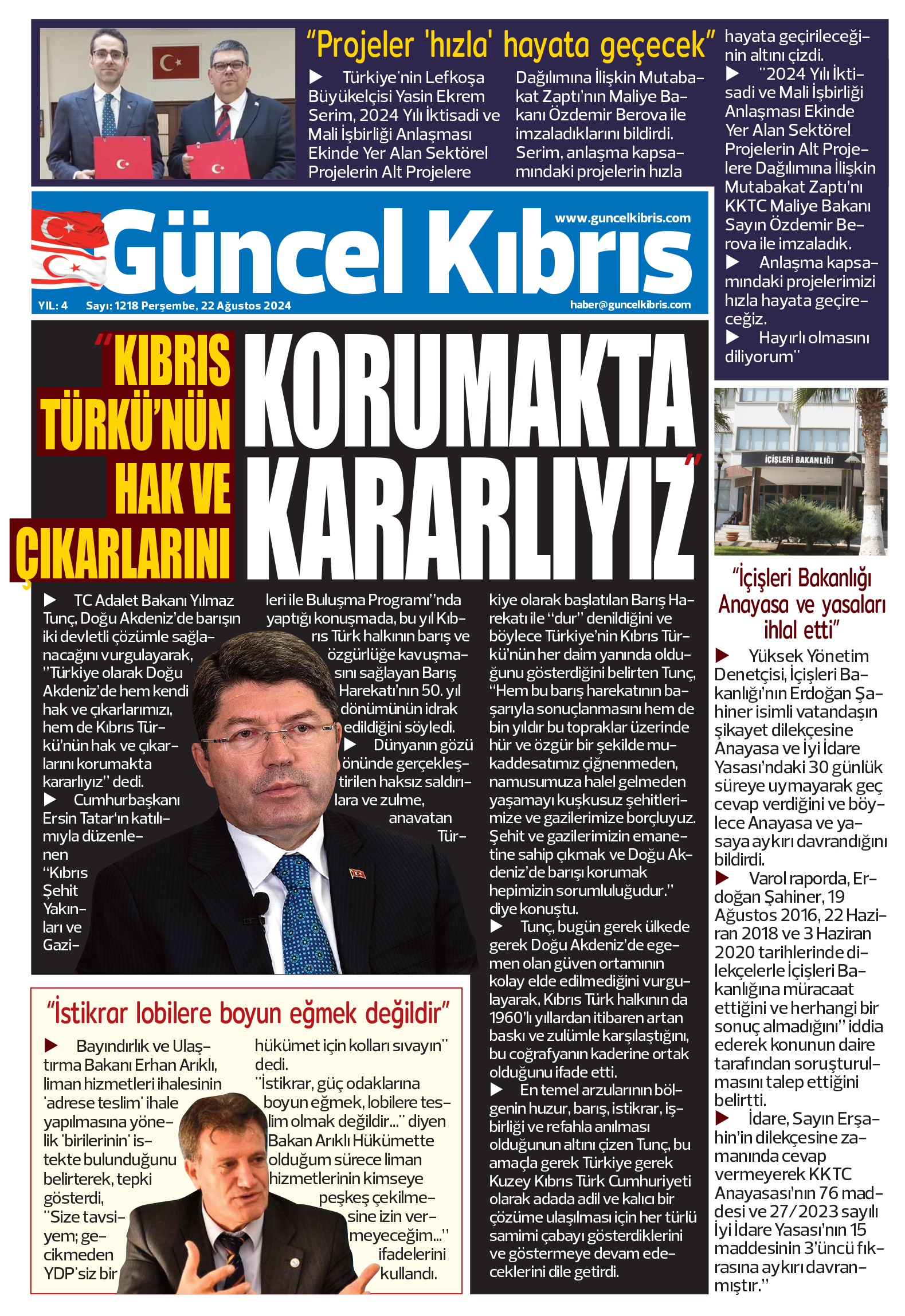 22 Ağustos 2024’te KKTC’de yayınlanan gazete manşetleri