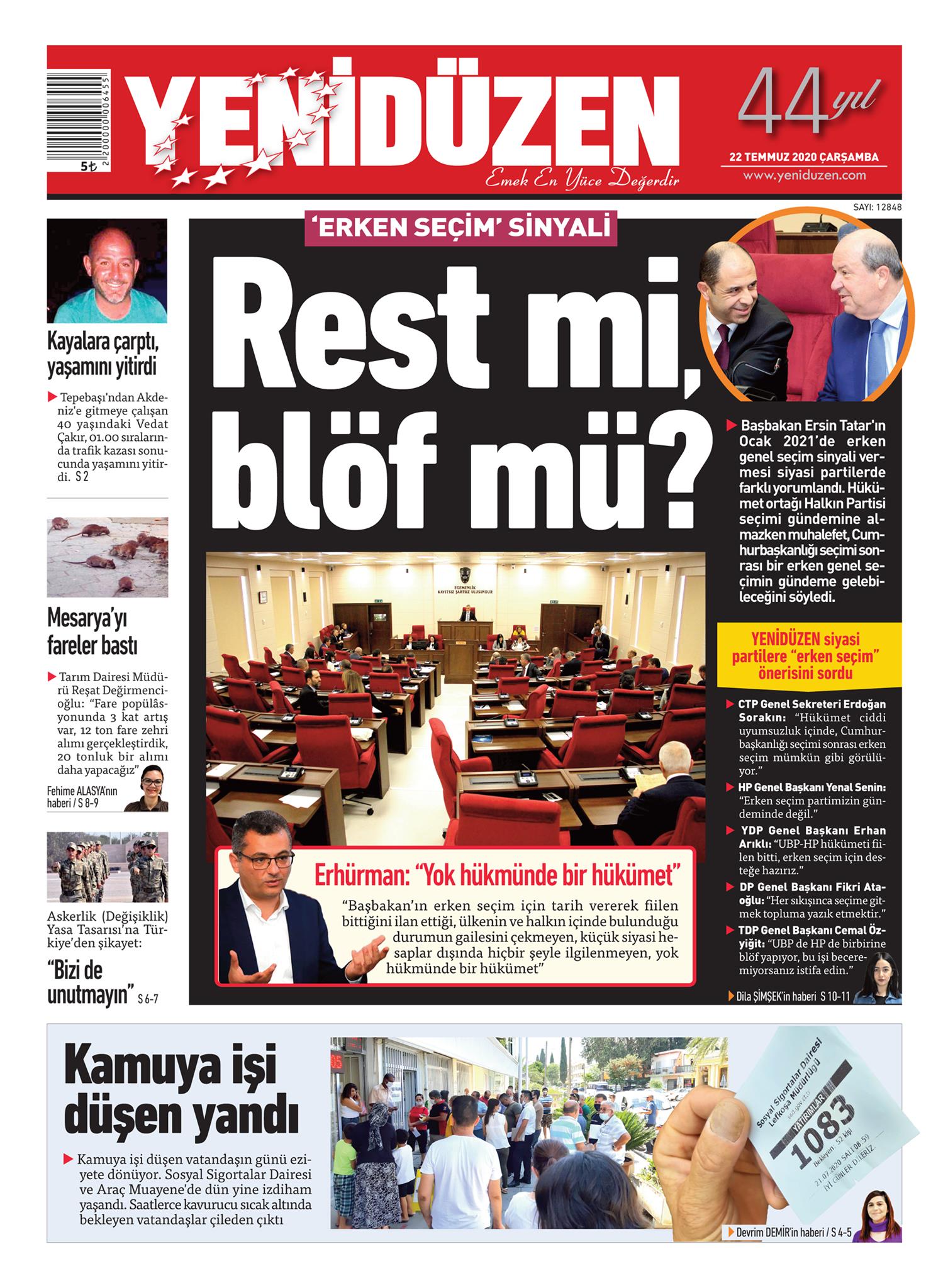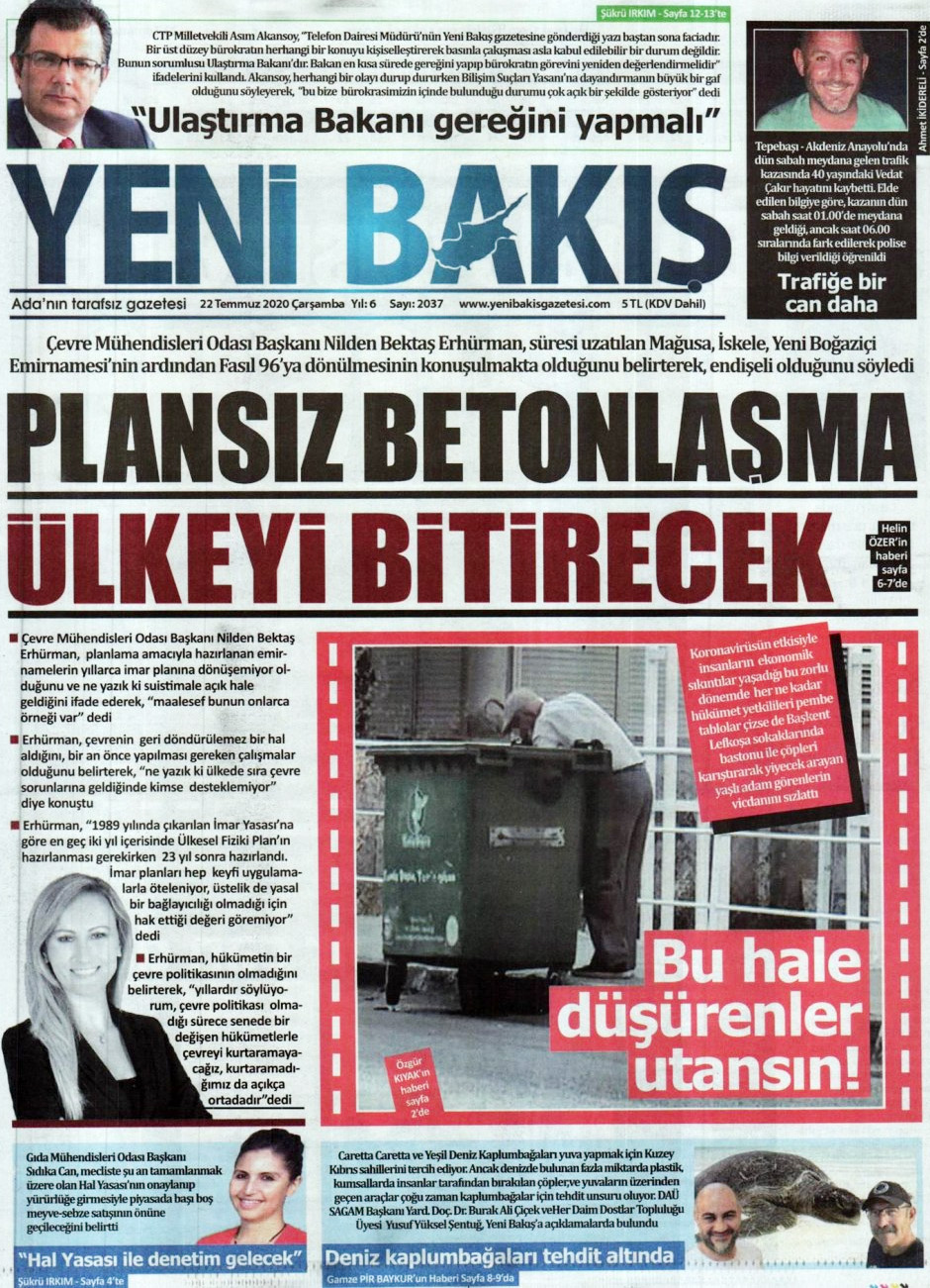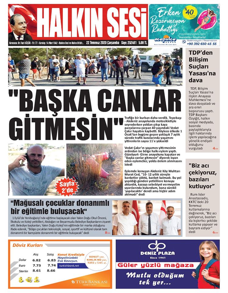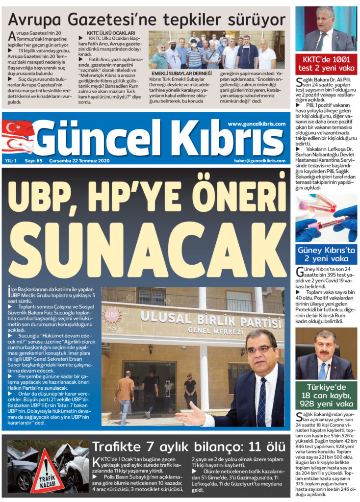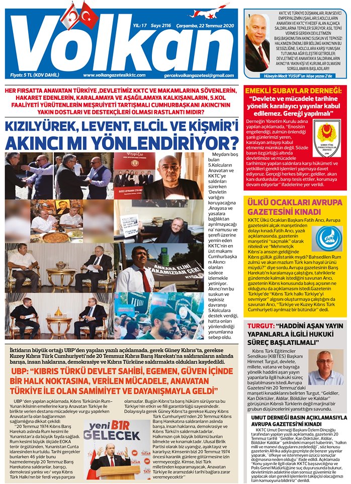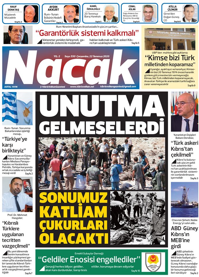 22 Temmuz 2020 tarihinde KKTC yayınlanan gazete manşetleri