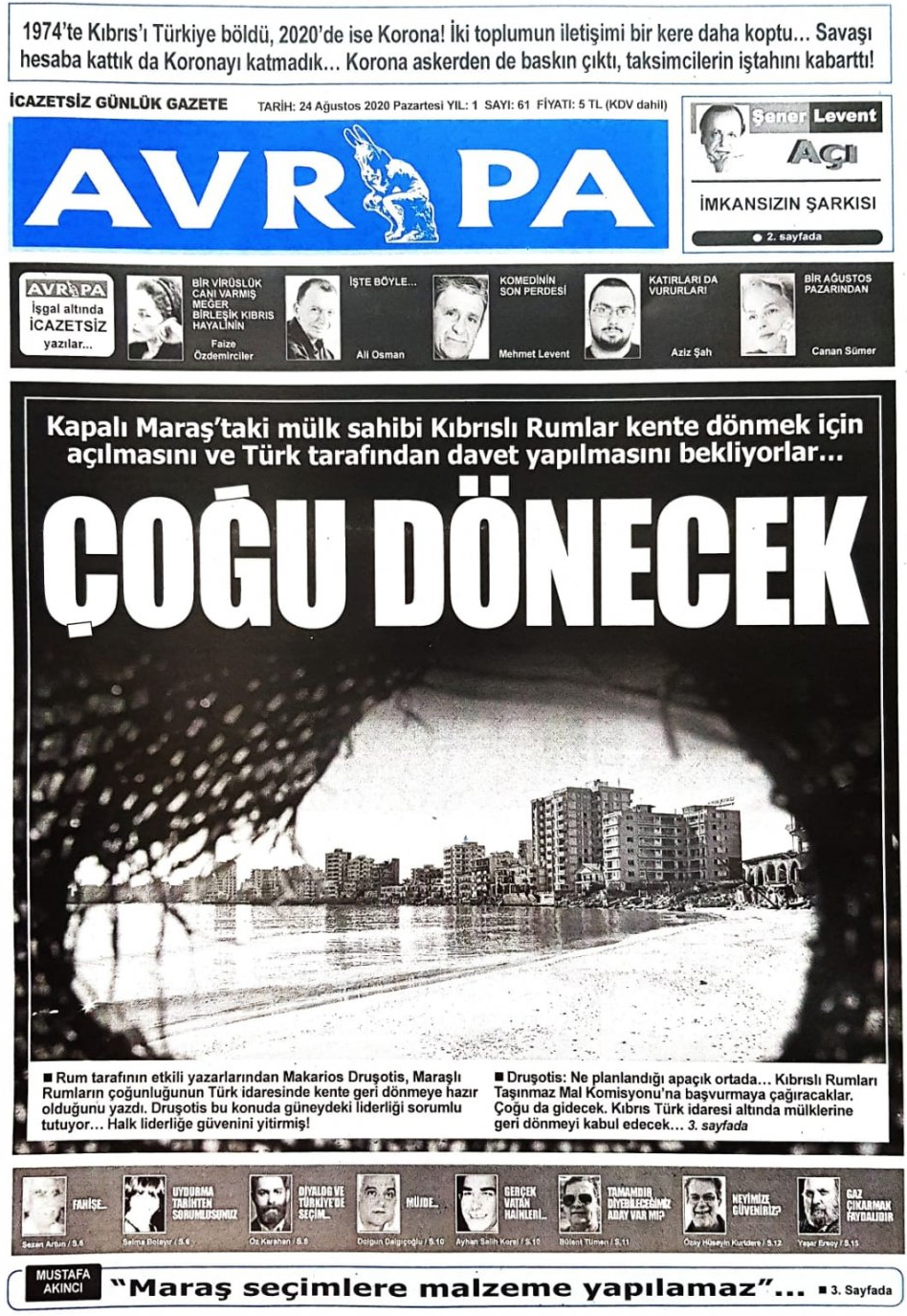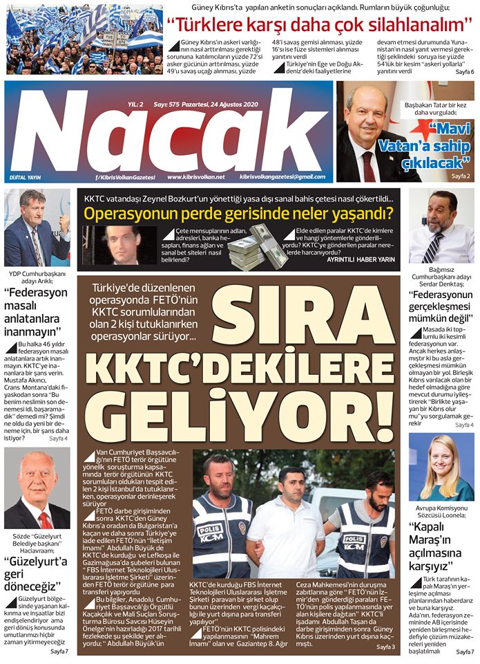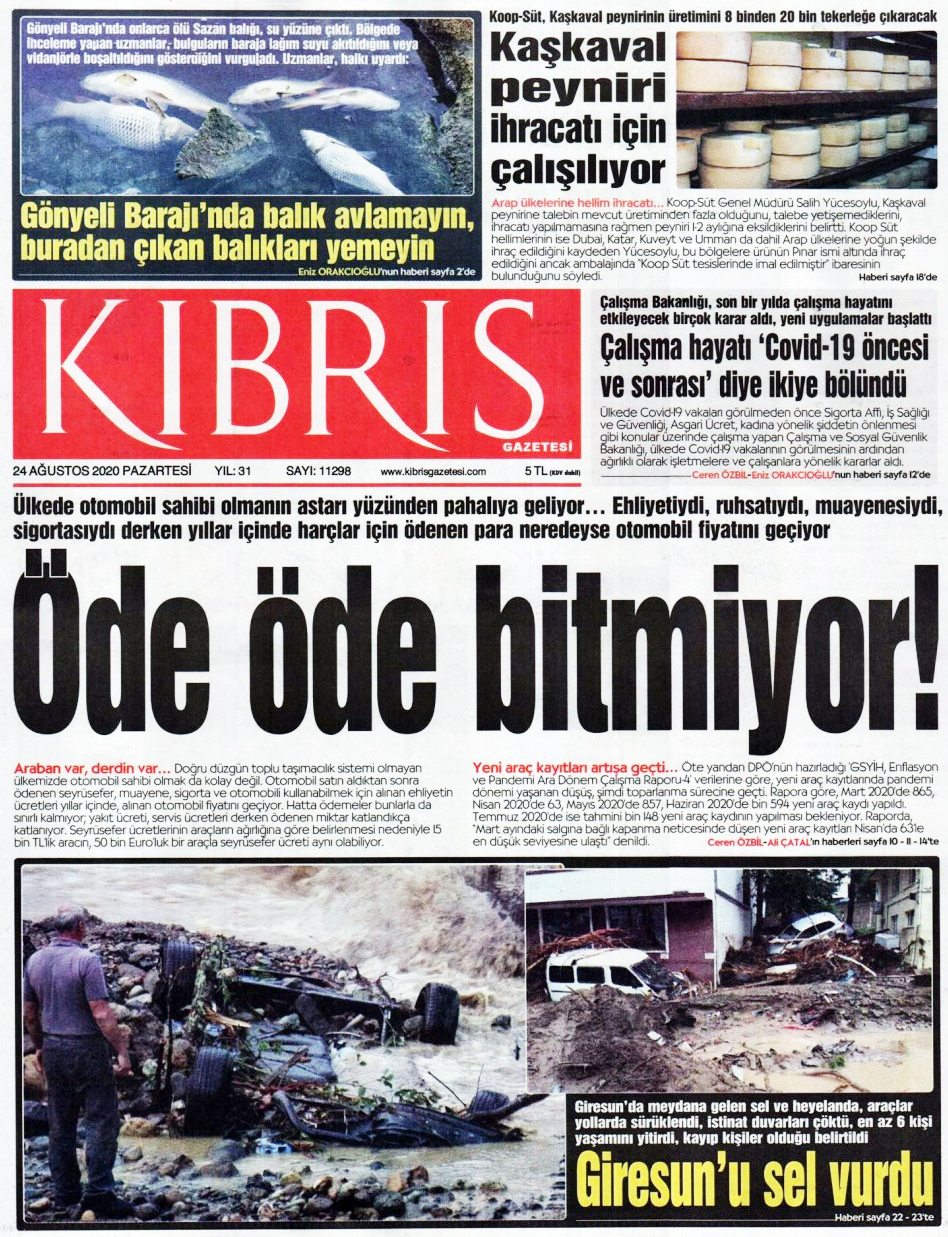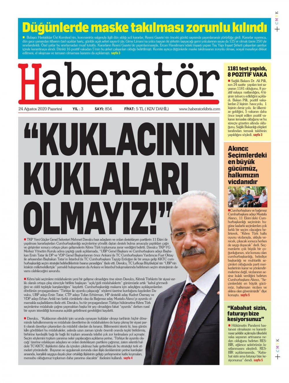 24 Ağustos 2020 tarihinde KKTC yayınlanan gazete manşetler