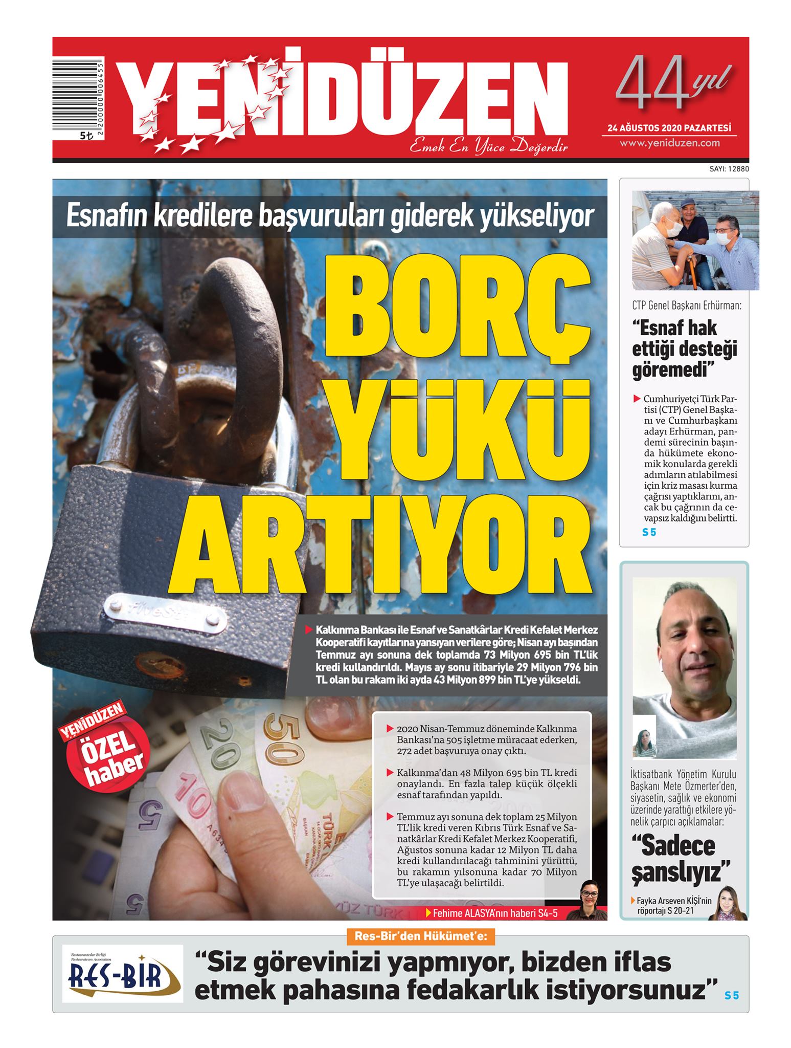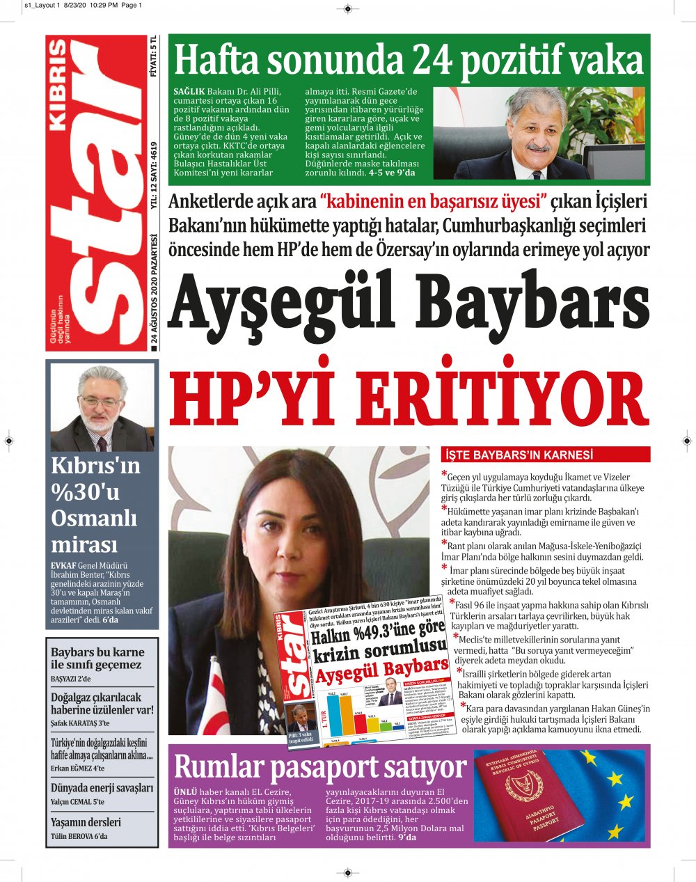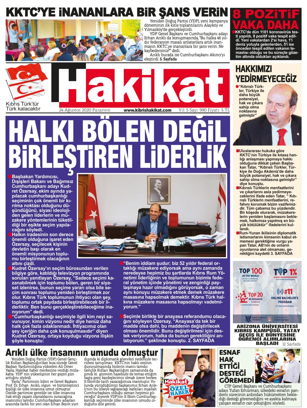 24 Ağustos 2020 tarihinde KKTC yayınlanan gazete manşetler