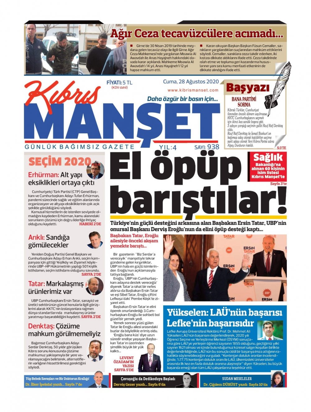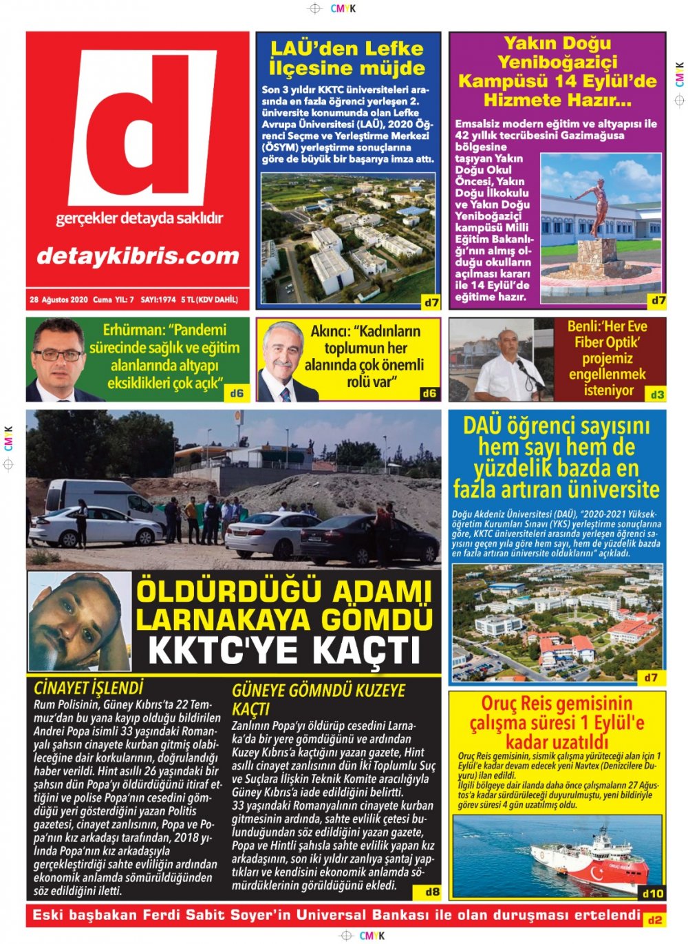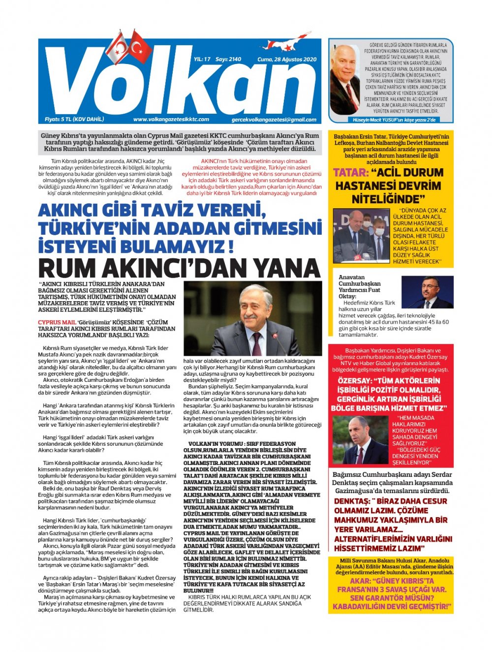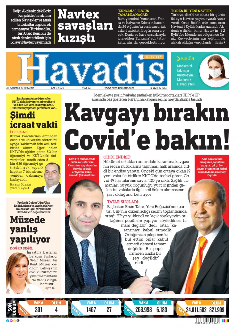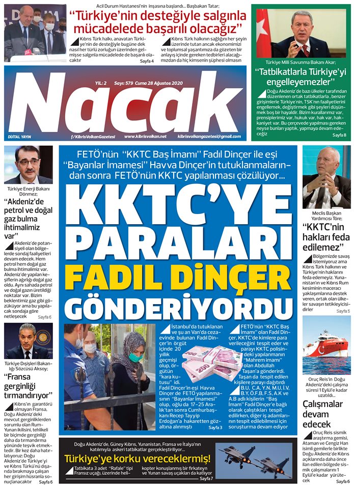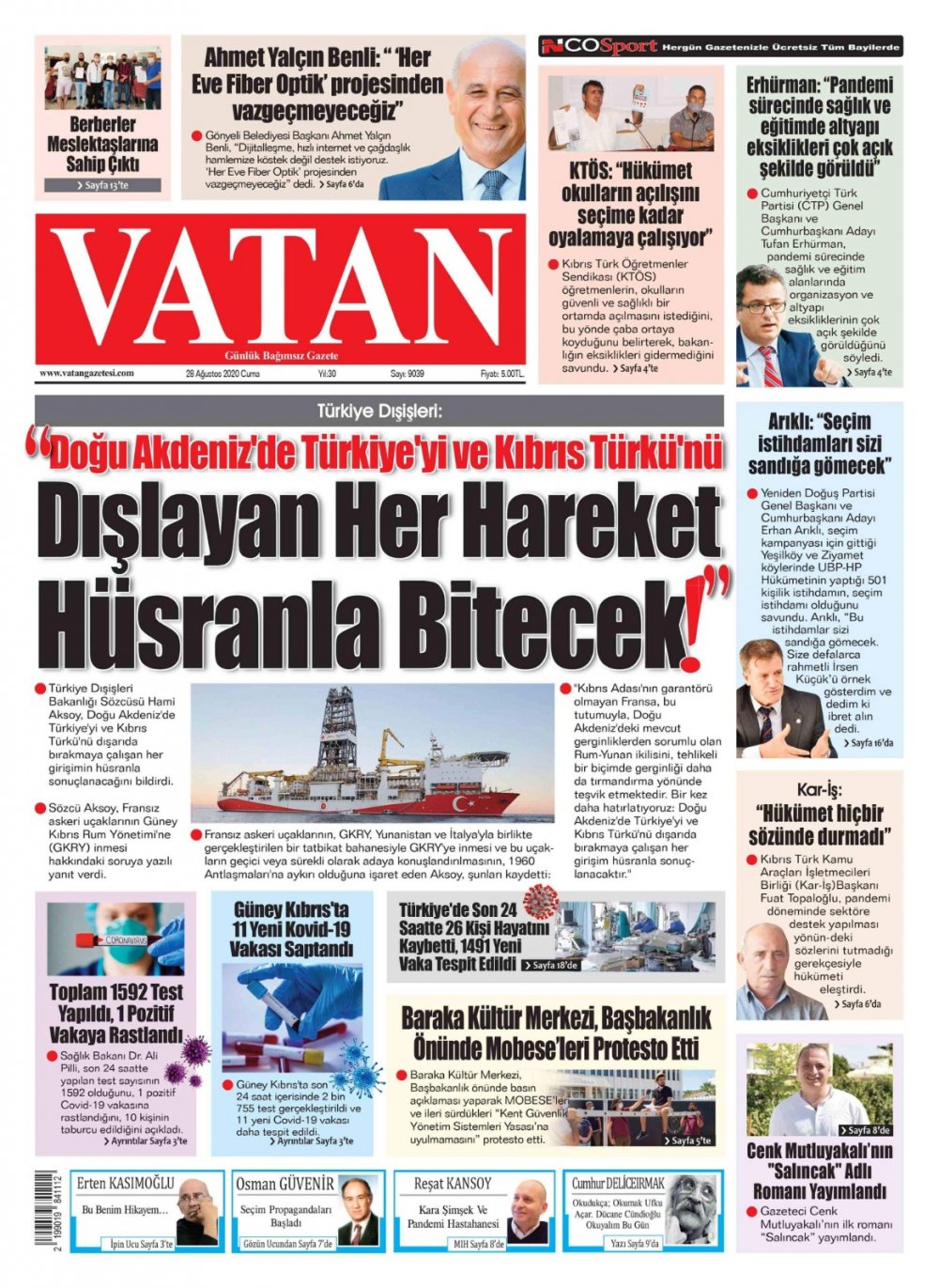 28 Ağustos 2020 tarihinde KKTC yayınlanan gazete manşetleri
