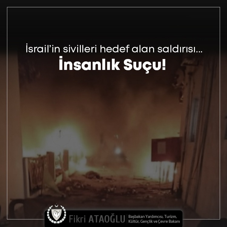 Başbakan Yardımcısı Turizm Kültür Gençlik ve Çevre Bakanı Fikri Ataoğlu, Gazze’deki El-Ehli Baptist Hastanesi’ne yapılan İsrail saldırısını kınadı. Saldırının sivil halkı hedef aldığını, 500’den fazla sivilin hayatını kaybettiğini ve İsrail’in bu eyleminin insanlık ve savaş suçu olduğunu belirtti. İsrail’e Filistin halkına yönelik şiddeti sonlandırma çağrısında bulunan Ataoğlu, saldırıda hayatını kaybedenlere Tanrı’dan rahmet, yaralılara acil şifalar diledi.