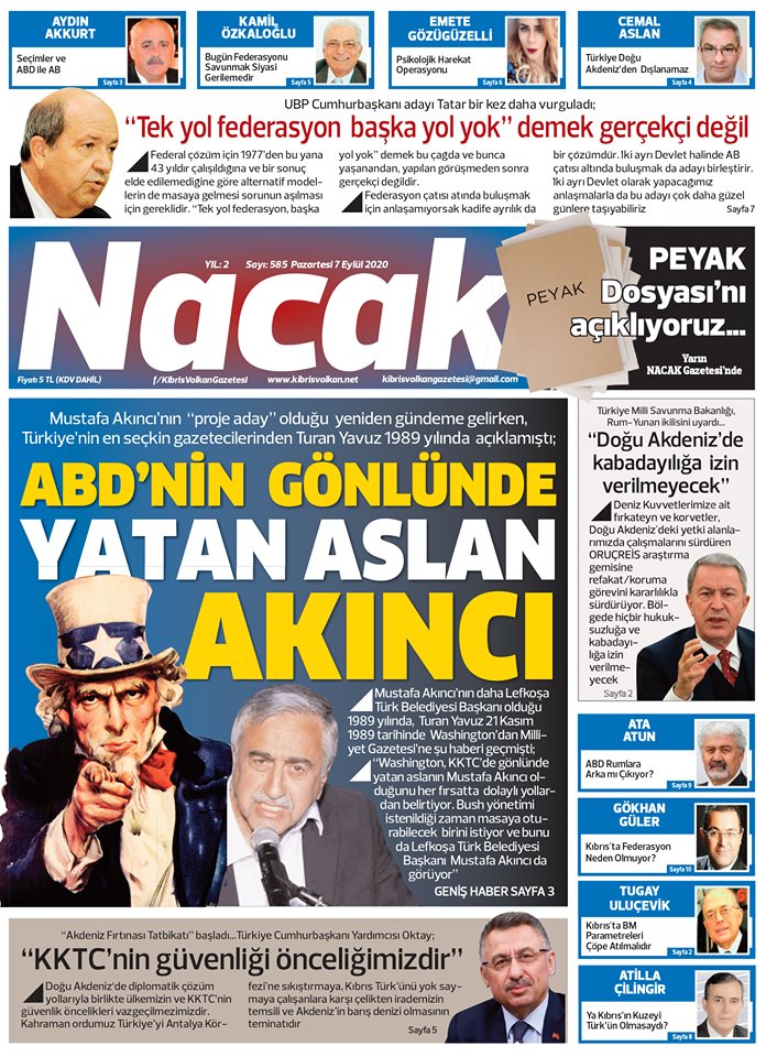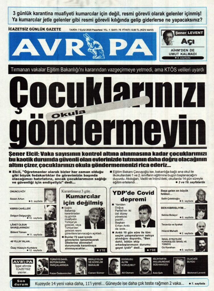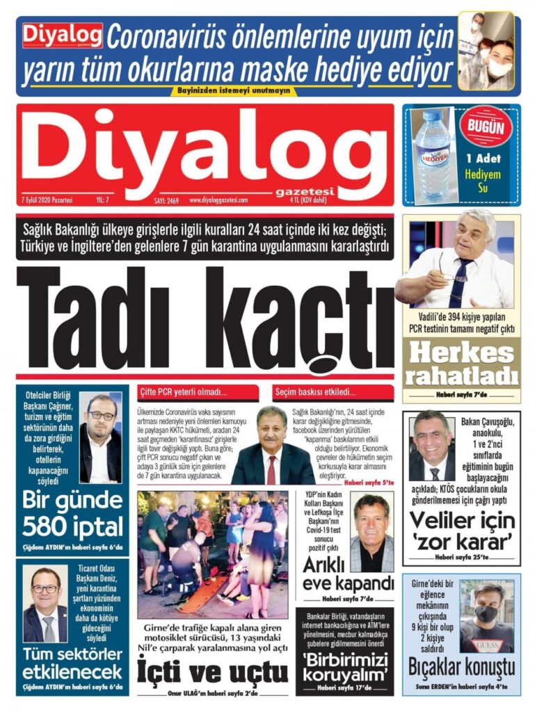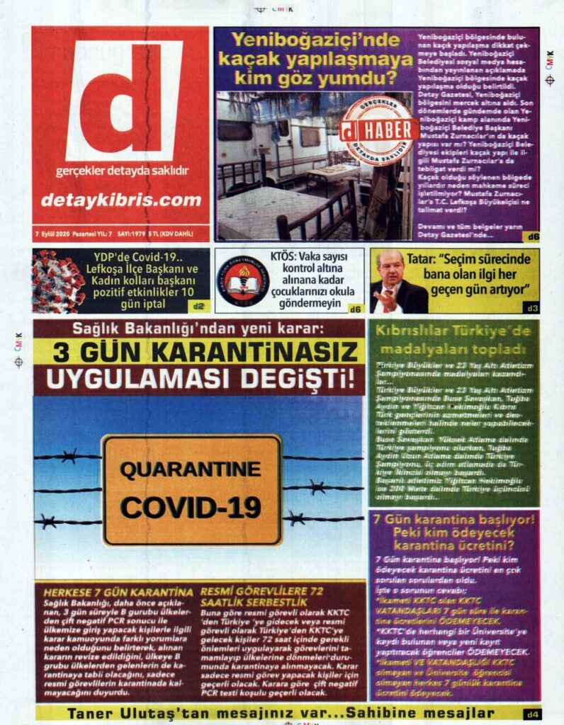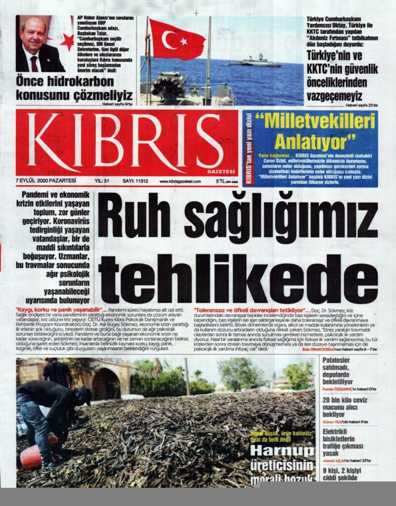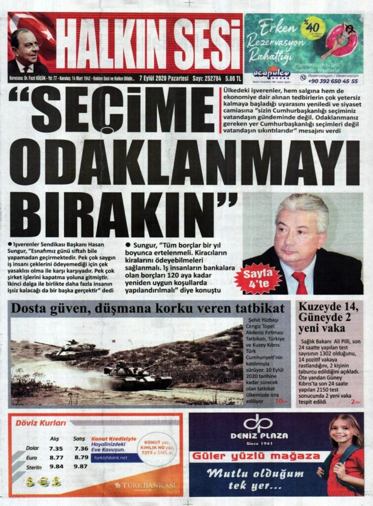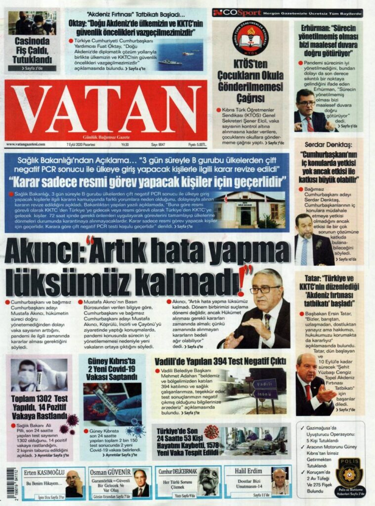 7 Eylül 2020 tarihinde KKTC’de yayınlanan gazete manşetleri