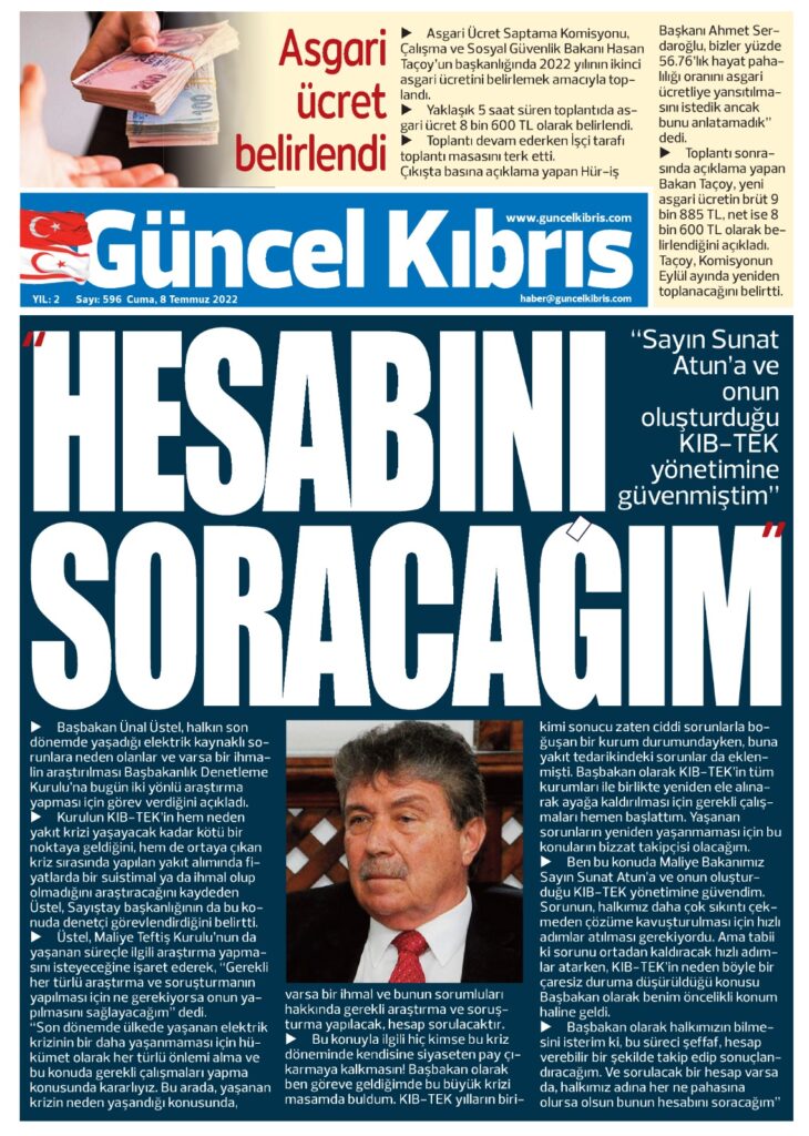 8 Temmuz 2022’de KKTC’de yayınlanan gazete manşetleri