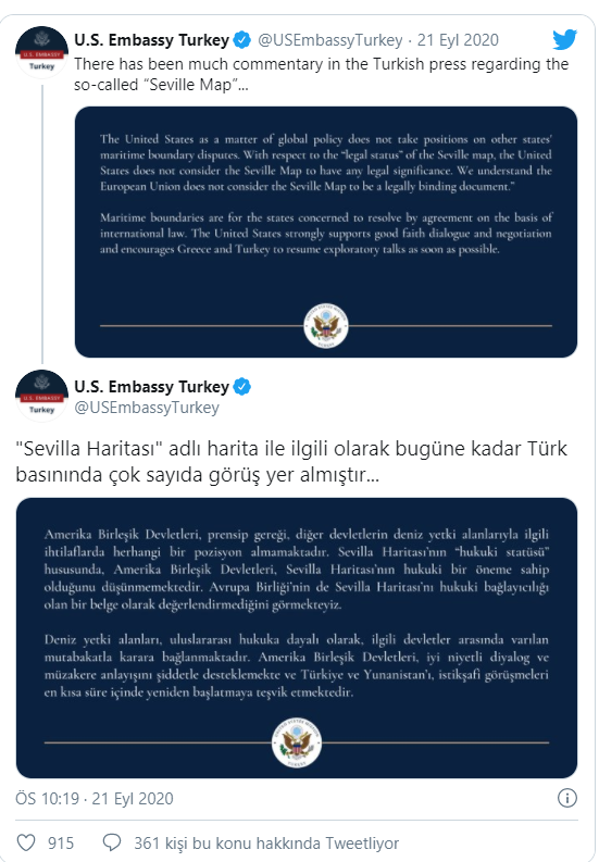 ABD’nin Ankara Büyükelçiliği’nden Doğu Akdeniz’de Yunanistan tezlerinin kaynağı olan Sevilla haritasına yönelik önemli bir açıklama geldi.