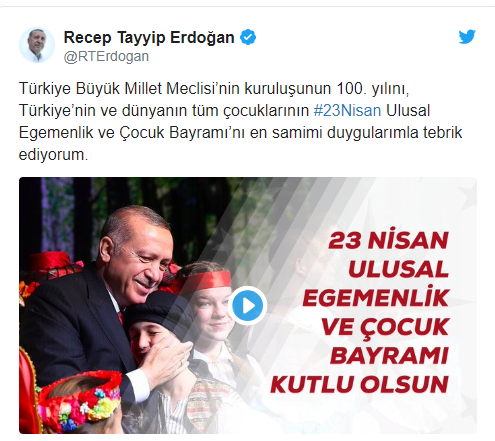 Cumhurbaşkanı Erdoğan, Twitter hesabından yaptığı paylaşımda, “Türkiye Büyük Millet Meclisi’nin kuruluşunun 100. yılını, Türkiye’nin ve dünyanın tüm çocuklarının 23 Nisan Ulusal Egemenlik ve Çocuk Bayramı’nı en samimi duygularımla tebrik ediyorum.” ifadesini kullandı.