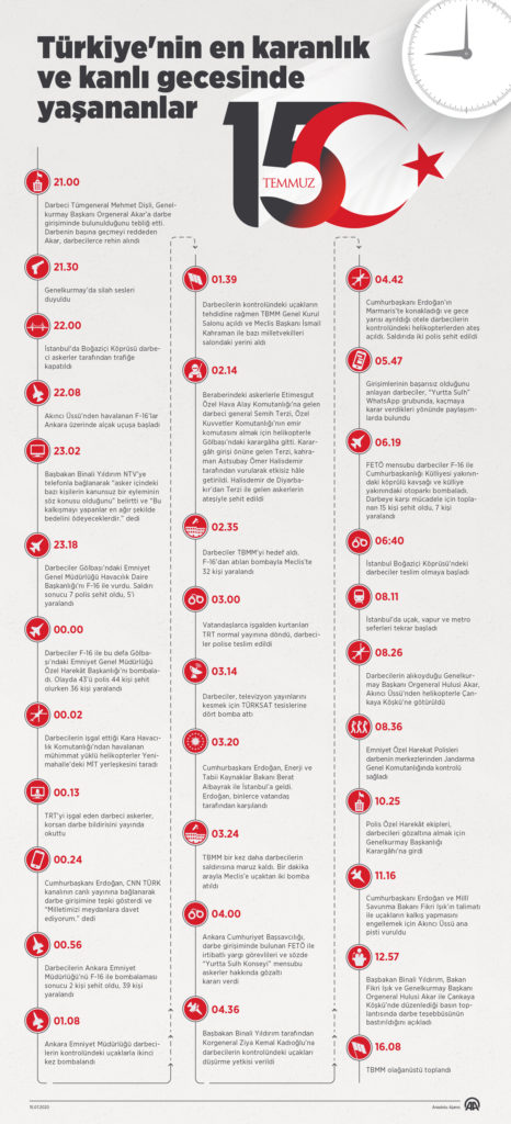 AA muhabirinin derlediği bilgilere göre, Türk Silahlı Kuvvetlerine sızmış FETÖ mensubu ve bu örgütü destekleyen 8 binin üzerinde askeri personel, 35 uçak, 3 gemi, 37 helikopter, 74’ü tank 246 zırhlı araç ve 4 bine yakın hafif silahın kullanıldığı darbe girişimi, Türkiye Cumhuriyeti tarihine kara bir leke olarak düştü.