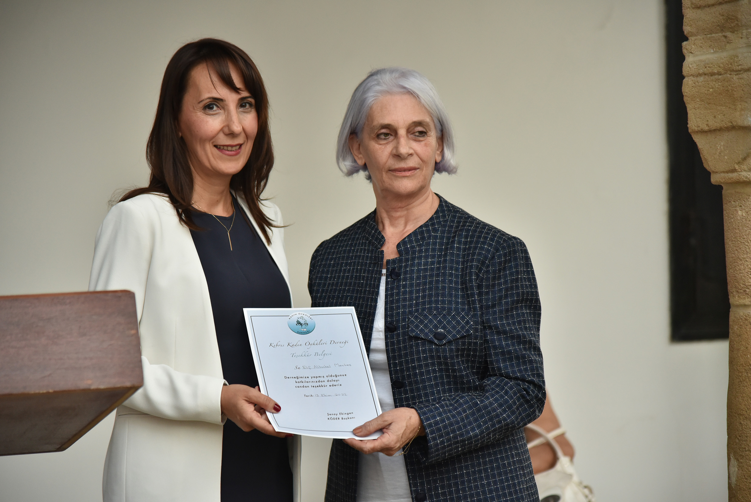 Kıbrıs Kadın Öyküleri Derneği Başkanı Şenay Ekingen de konuşmasında, “Bu gece çok özel geçmişi anlatan bir gece, sergi geçmişi anlatan objelerden oluşuyor” dedi.