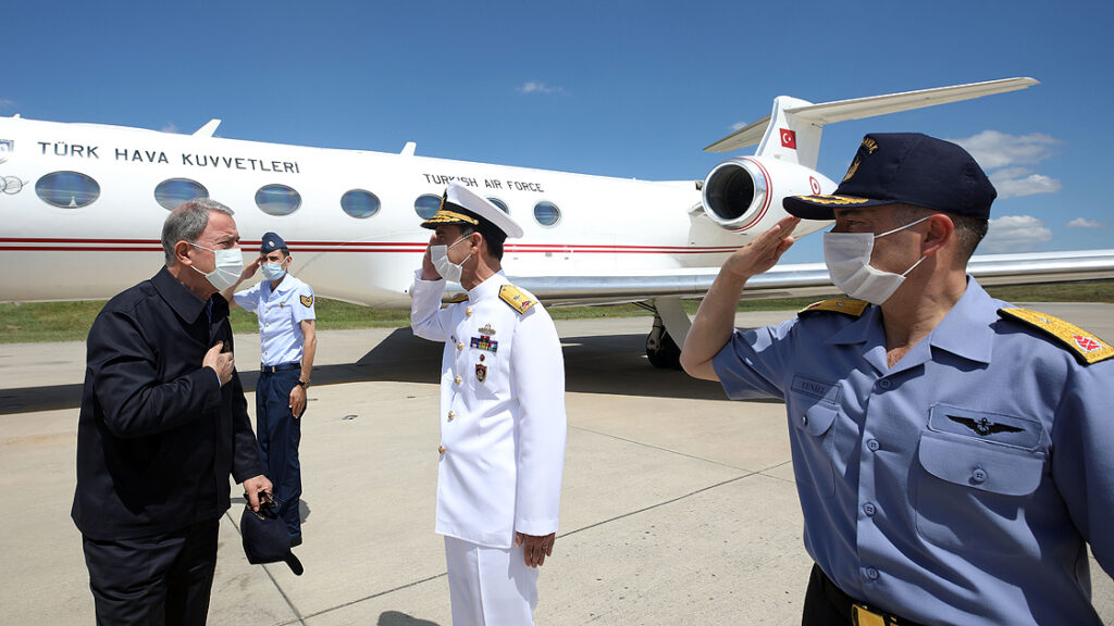 Yüksek Askeri Şura kararları kapsamında 30 Ağustos itibarıyla oramiralliğe terfi eden Donanma Komutanı Koramiral Ercüment Tatlıoğlu ve diğer komutanlar tarafından karşılanan Akar, Oruç Reis araştırma gemisine refakat eden askeri gemilerin komuta edildiği Donanma Komutanlığında inceleme ve denetlemelerde bulunuyor.