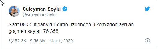 İçişleri Bakanı Soylu, saat 09.55 itibarıyla Edirne üzerinden ülkeden ayrılan göçmen sayısının 76 bin 358 olduğunu bildirdi.İçişleri Bakanı Süleyman Soylu, Twitter hesabından, Türkiye’den ayrılan göçmen sayılarına ilişkin, “Saat 09.55 itibarıyla Edirne üzerinden ülkemizden ayrılan göçmen sayısı 76 bin 358” bilgisini paylaştı.
