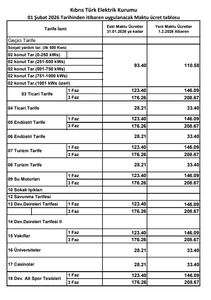 Kıbrıs Türk Elektrik Kurumu (Kıb-Tek), bugünden itibaren elektrik enerjisi satış tarifelerinde uygulanmakta olan maktu ücretlerde düzenlemeye gittiğini açıkladı.