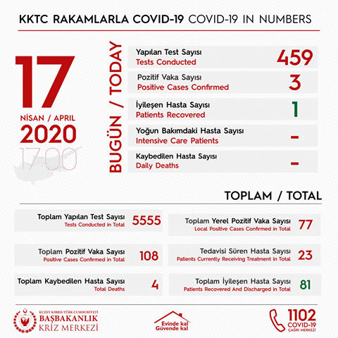 Sağlık Bakanı Pilli ,bugün toplam459 test yapıldığını 3 pozitif vaka tespit edildiğini söyledi.