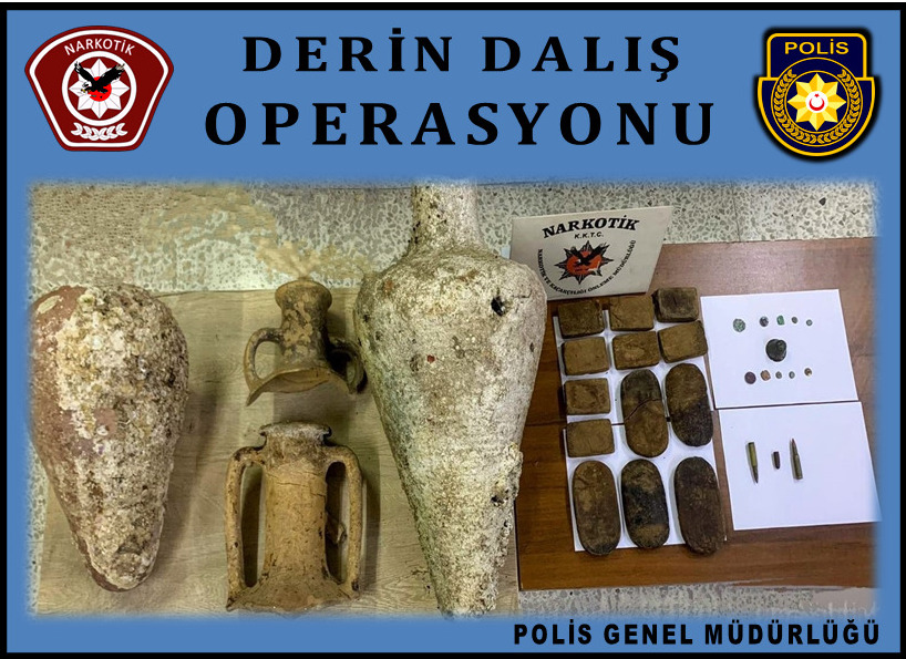 15.06.2023 tarihinde, saat 22:30 sıralarında, İskele’de, Narkotik ve Kaçakçılığı Önleme Müdürlüğü Ekipleri tarafından gerçekleştirilen operasyon (Derin Dalış Operasyonu) kapsamında, O.İ.(E-28)’in kullanımındaki araçta yapılan aramada, yaklaşık 2 kilogram ağırlığında hintkeneviri (kubar esrar) türü uyuşturucu olduğuna inanılan madde ve bahse konu şahsın Dipkarpaz’daki ikametgahında yapılan aramada ise, toplam 3 adet canlı mermi ve eski eser nitelikli 8 adet sikke, 1 adet altın kolye ucu, 1 adet zil, 2 adet anfora ile 2 adet kırık anfora parçası bulunarak emare olarak alınmıştır. Bahse konu şahıs tutuklanmış olup, soruşturma devam etmektedir.