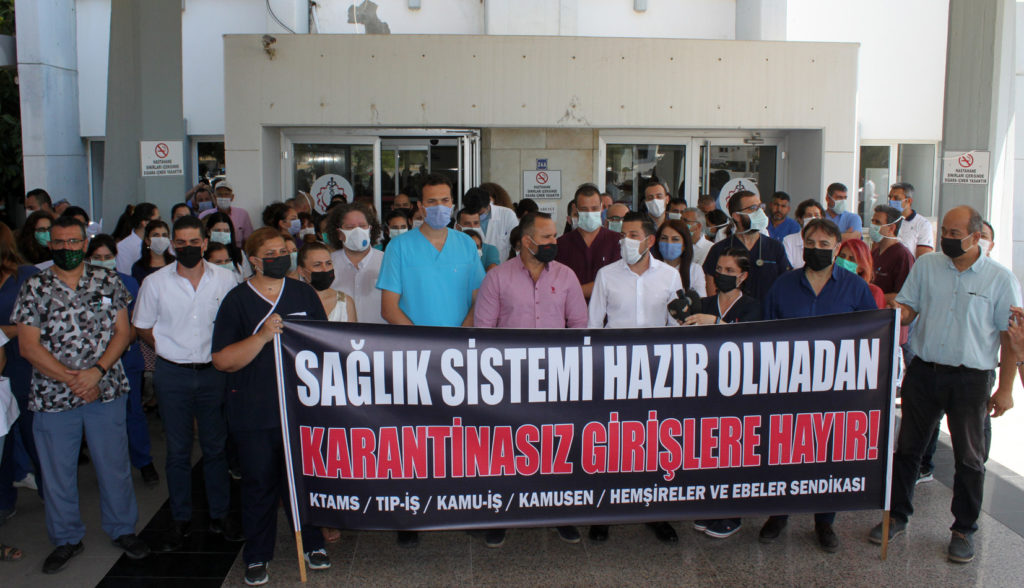 Sağlık çalışanları saat 10.30’da Lefkoşa Dr. Burhan Nalbantoğlu Devlet Hastanesi önüne çıkarak, “Sağlık sistemi hazır olmadan, karantinasız girişlere hayır” diyerek hükümete seslendi.