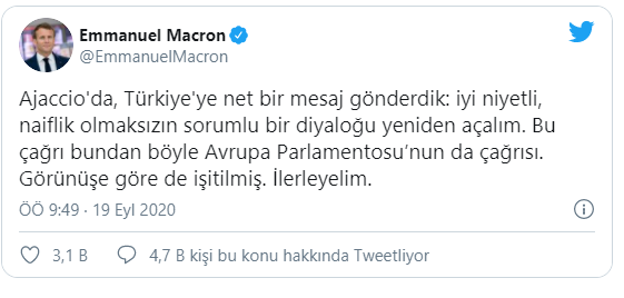 “Ajaccio’da, Türkiye’ye net bir mesaj gönderdik: iyi niyetli, naiflik olmaksızın sorumlu bir diyaloğu yeniden açalım. Bu çağrı bundan böyle Avrupa Parlamentosu’nun da çağrısı. Görünüşe göre de işitilmiş. İlerleyelim.”