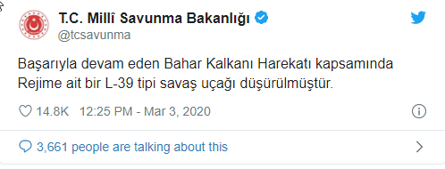 Milli Savunma Bakanlığı, Bahar Kalkanı Harekatı kapsamında rejime ait bir savaş uçağının düşürüldüğünü açıkladı.Milli Savunma Bakanlığından yapılan açıklamada, “Başarıyla devam eden Bahar Kalkanı Harekatı kapsamında rejime ait bir L-39 tipi savaş uçağı düşürülmüştür.” bilgisi paylaşıldı.