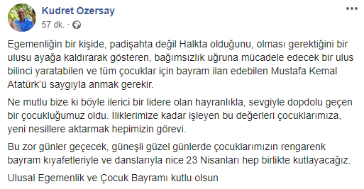 Özersay paylaşımında;‘Egemenliğin bir kişide, padişahta değil Halkta olduğunu, olması gerektiğini bir ulusu ayağa kaldırarak gösteren, bağımsızlık uğruna mücadele edecek bir ulus bilinci yaratabilen ve tüm çocuklar için bayram ilan edebilen Mustafa Kemal Atatürk’ü saygıyla anmak gerekir.