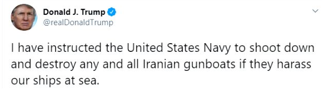Trump, her zaman olduğu gibi yine Amerika’da sabah saatlerinde kişisel Twitter sayfasından paylaşımlar yaptı. ABD Başkanı, koronavirüs haricinde İran’ı gündemine alarak şunları yazdı: “Amerika Donanması’na, denizde gemilerimizi taciz etmeleri durumunda İran’a ait tüm silahlı botlara ateş edip imha etme emrini verdim.”