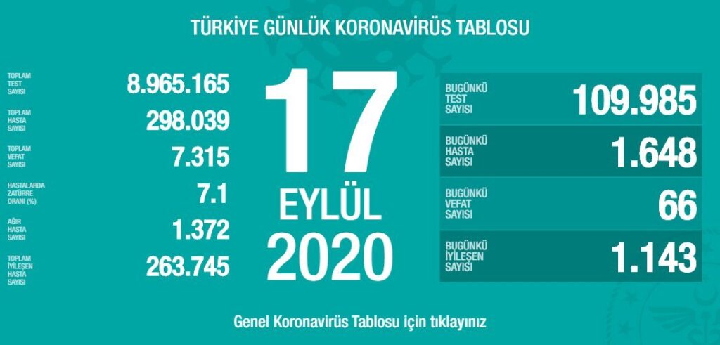 24 saatte 109 bin 985 test yapıldı ve 1648 kişiye daha tanı kondu. Yeni rakamlarla birlikte toplam vaka sayısı 298 bin 39 oldu.