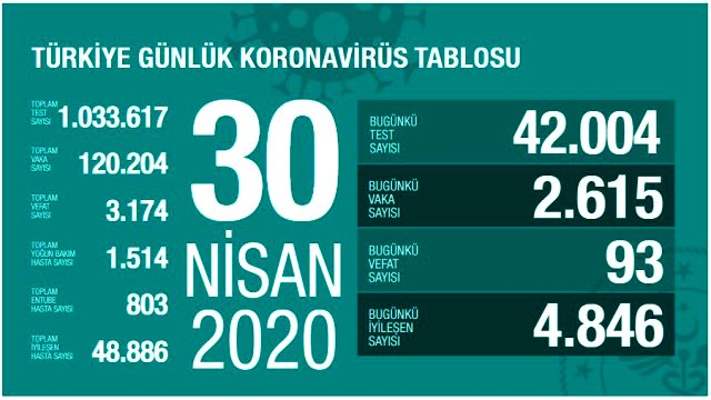 Türkiye’de 30 Nisan itibariyle koronavirüsten hayatını kaybedenlerin sayısı 93 artarak 3 bin 174’e, vaka sayısı ise 2 bin 615 artarak 120 bin 204’e yükseldi.