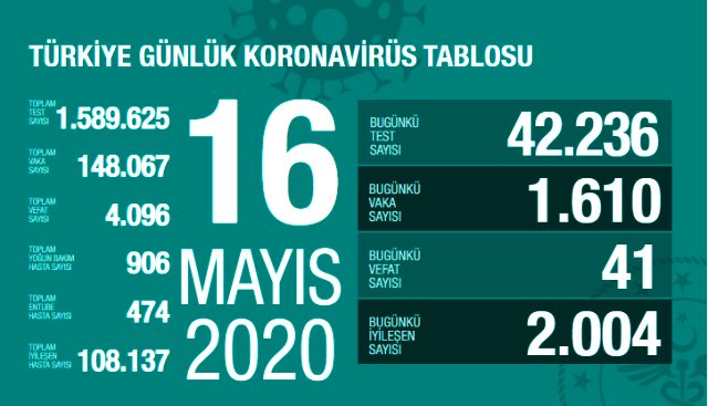 Ülkemizde koronavirüs kaynaklı ölüm ve vaka sayısı azalıyor. Türkiye’de yeni tip koronavirüs salgını nedeniyle hayatını kaybedenlerin sayısı 16 Mayıs’ta açıklanan verilere göre 41 artarak 4096’ya yükseldi. Son 24 saatte 1610 kişiye daha tanı kondu.