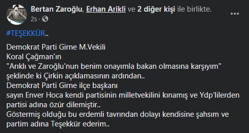 Yeniden Doğuş Partisi (YDP) Genel Sekreteri, Lefkoşa milletveki Bertan Zaroğlu, sosyal medya hesabından Hoca’ya teşekkür etti.
